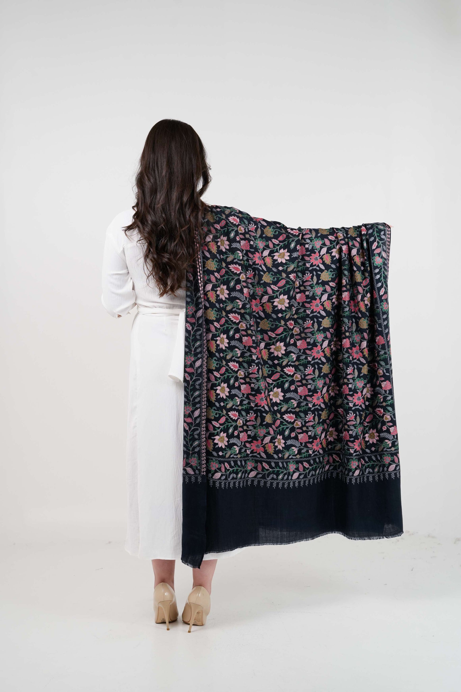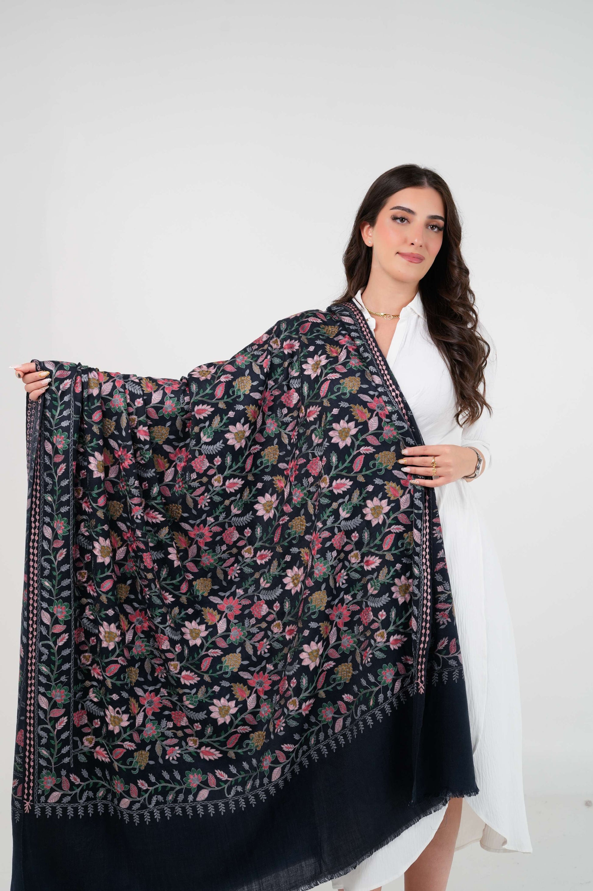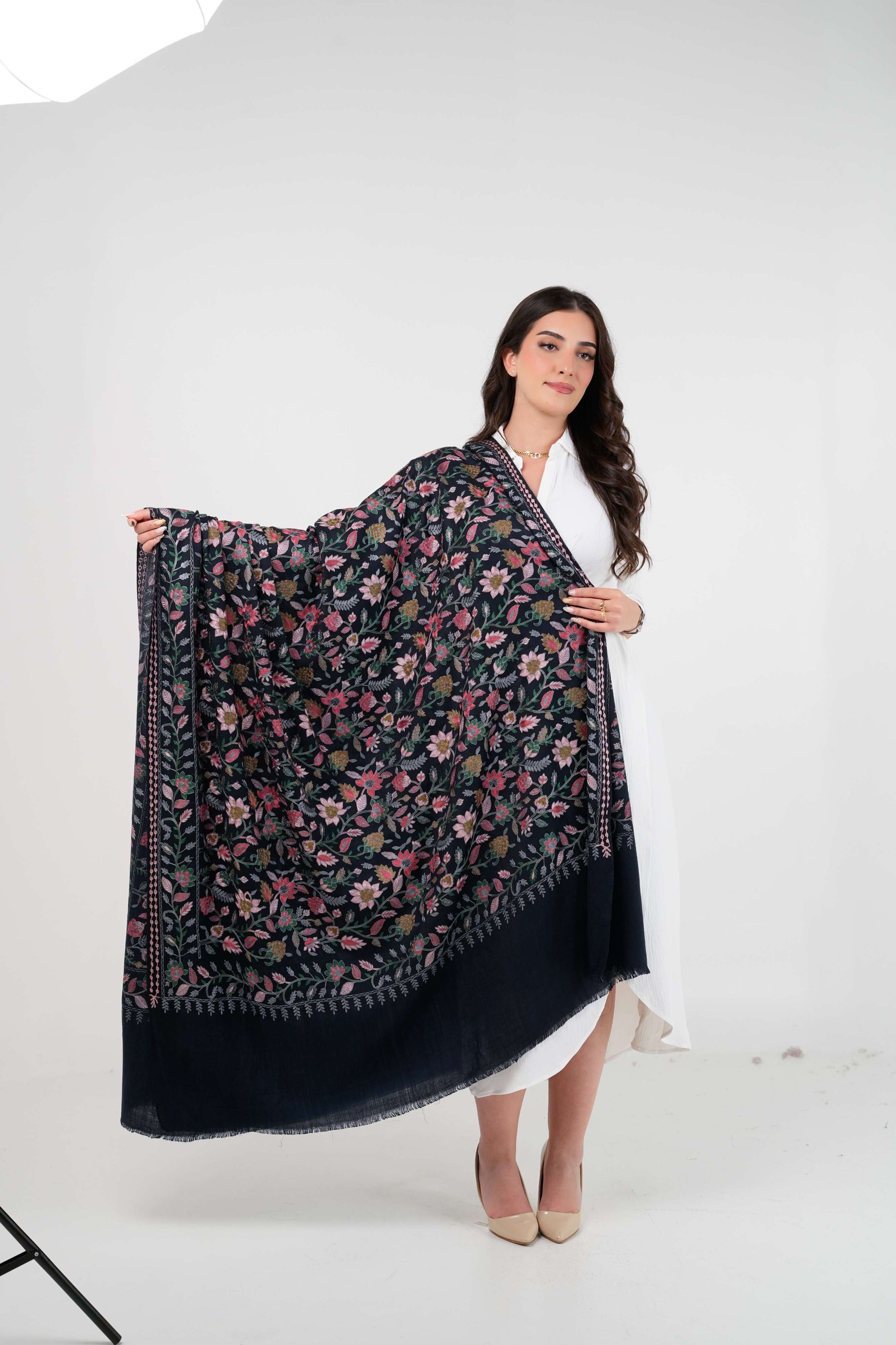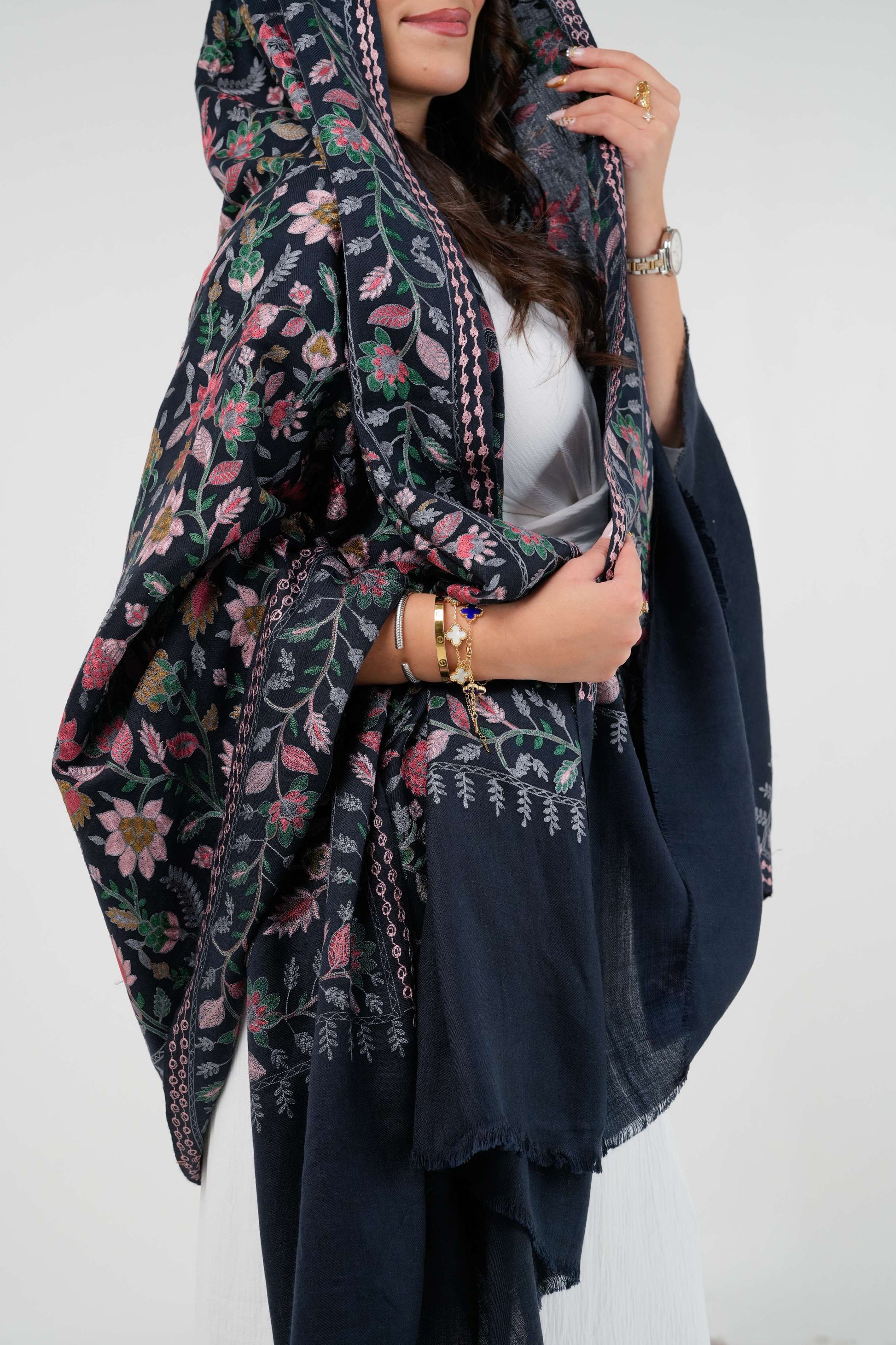 شال باشمينا كحلي مطرز عليه ورود باللون الوردي الفاتح والغامق و اللون الأخضر