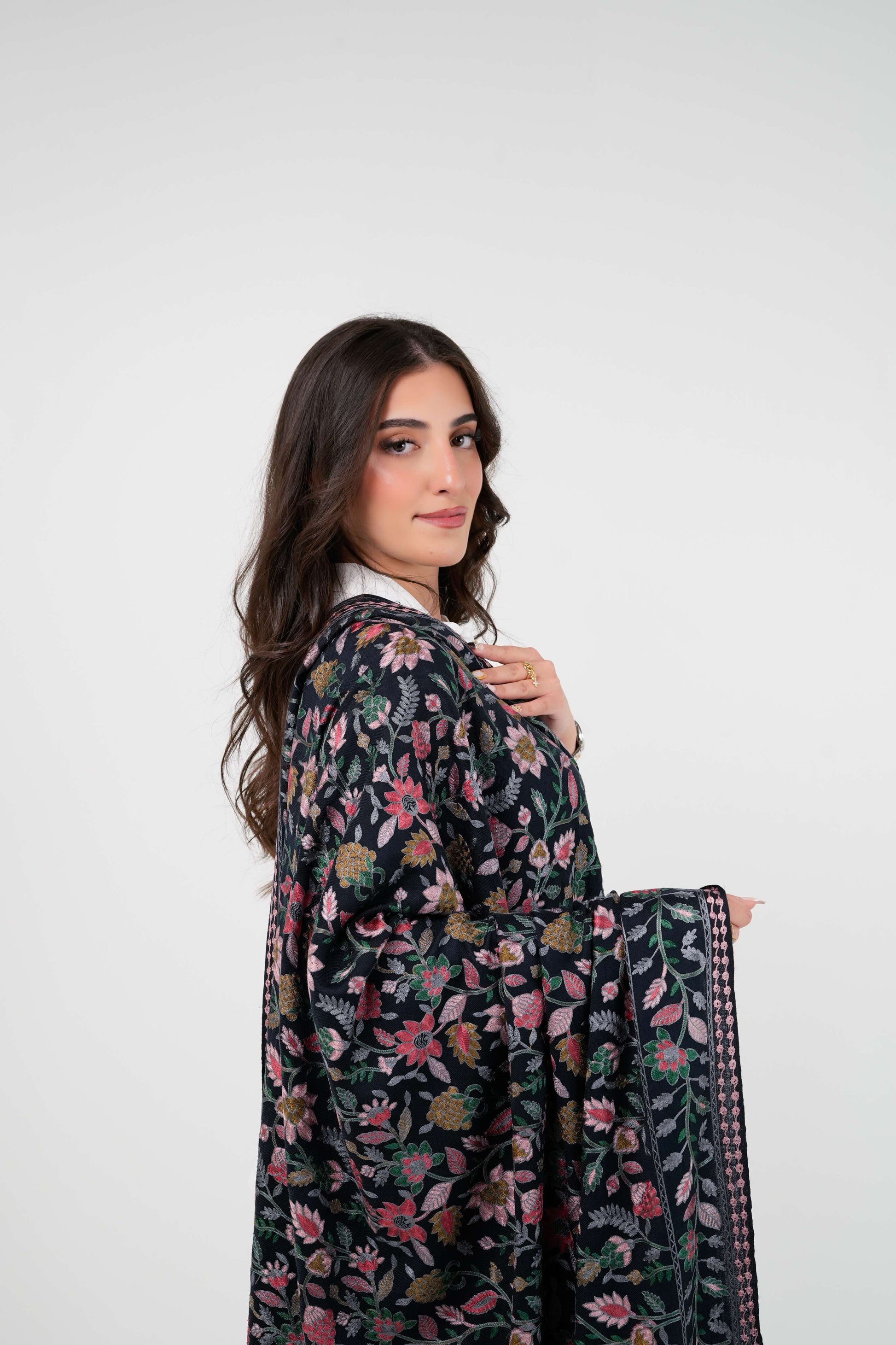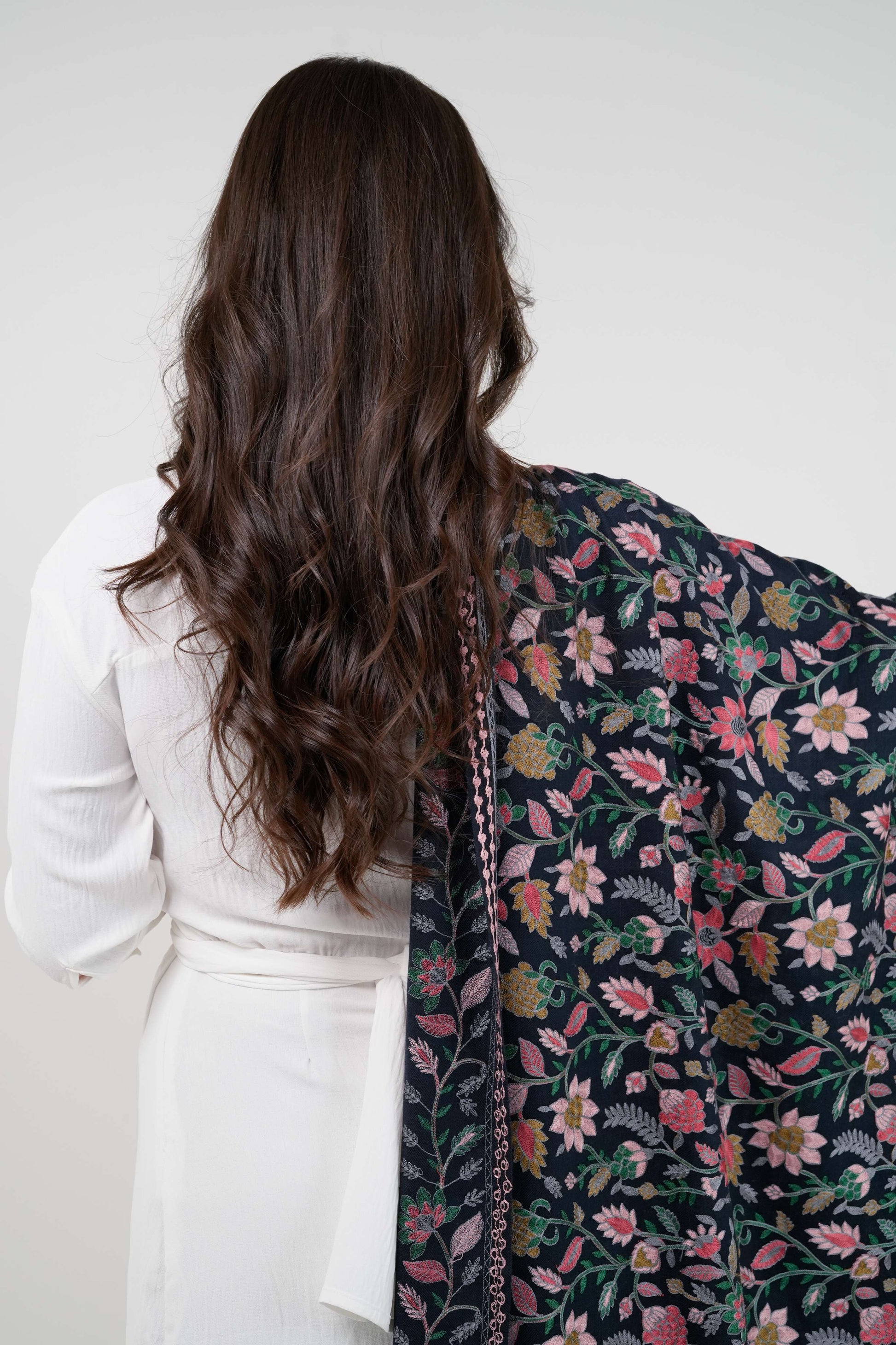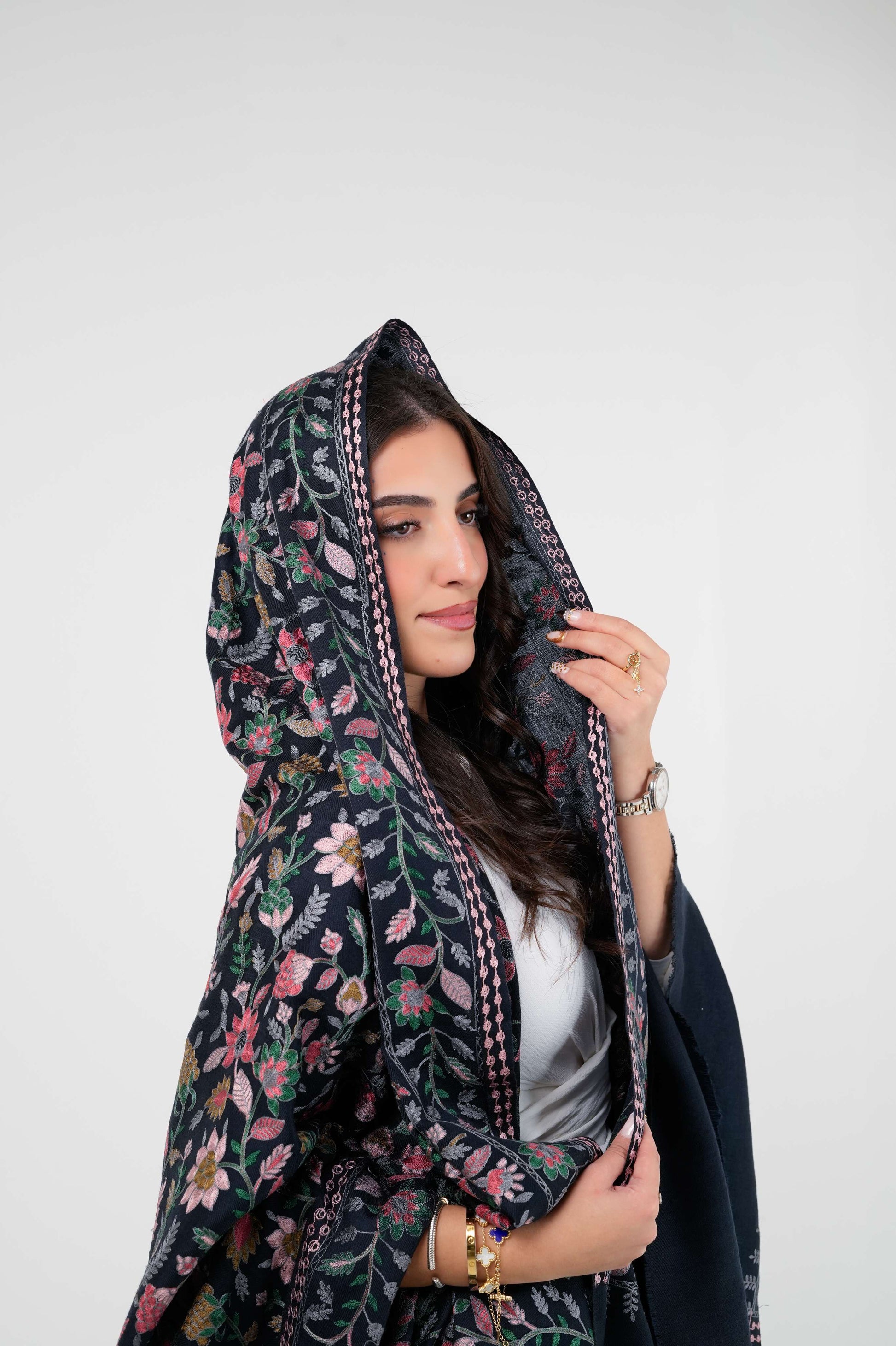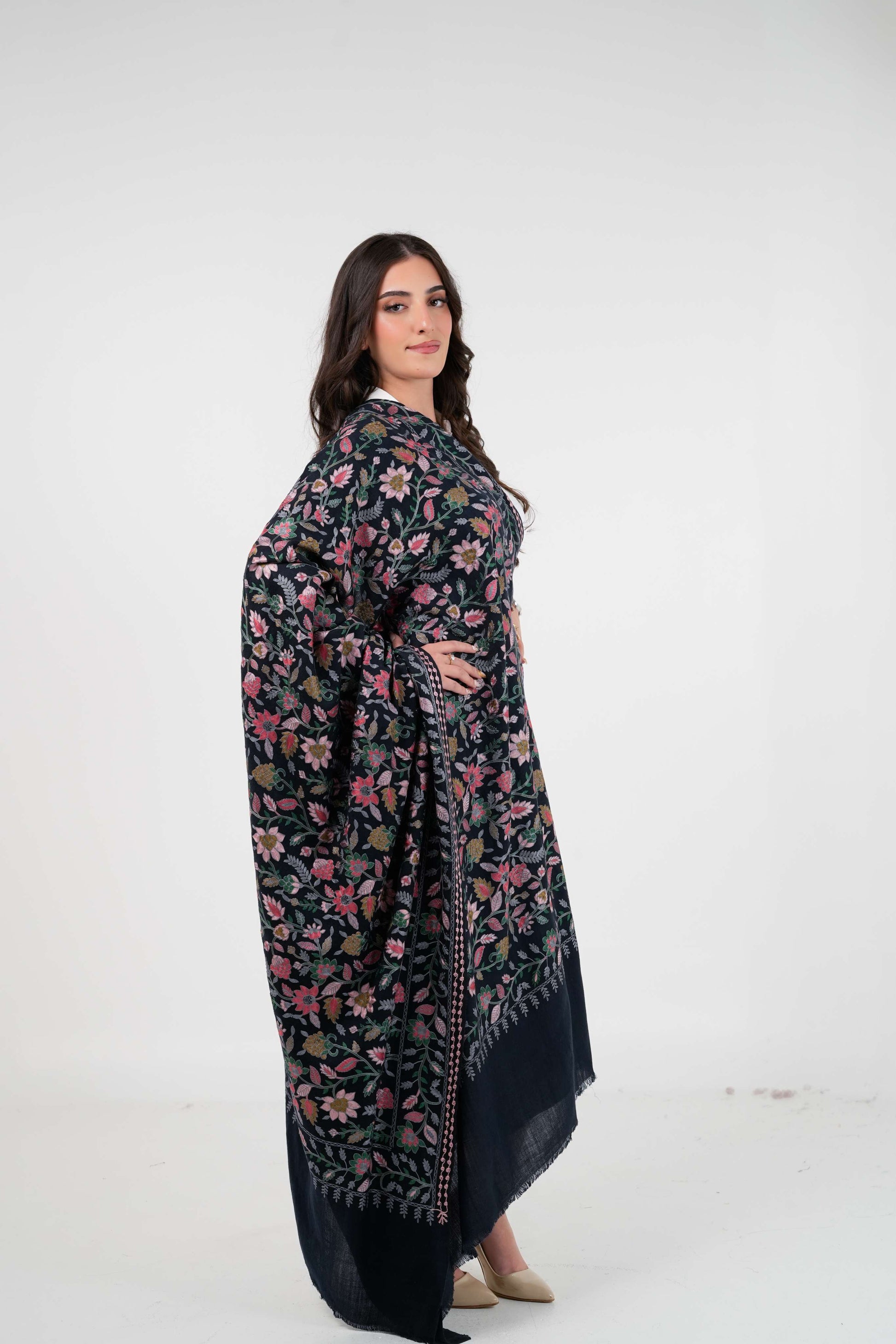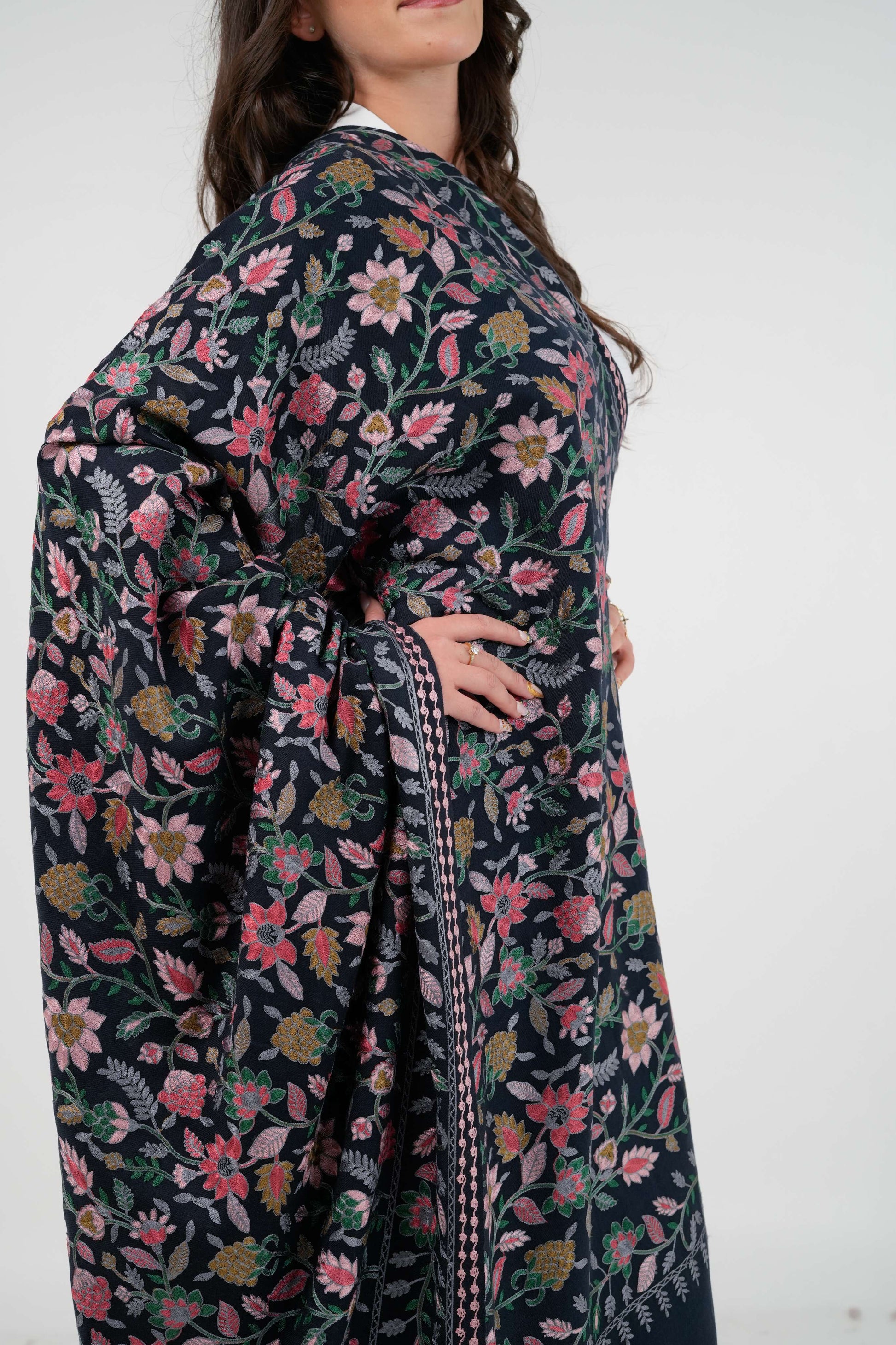 شال باشمينا كحلي مطرز عليه ورود باللون الوردي الفاتح والغامق و اللون الأخضر