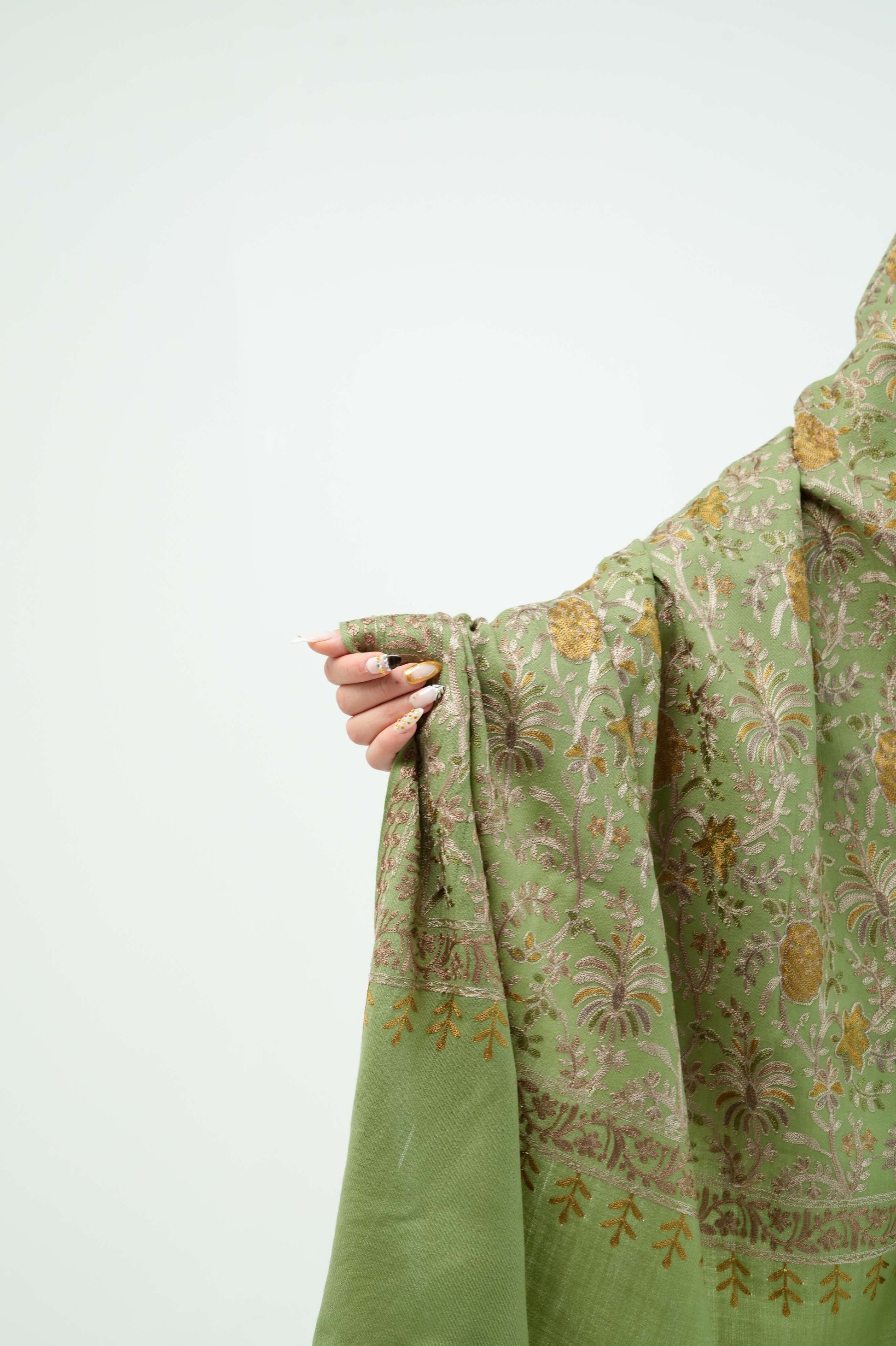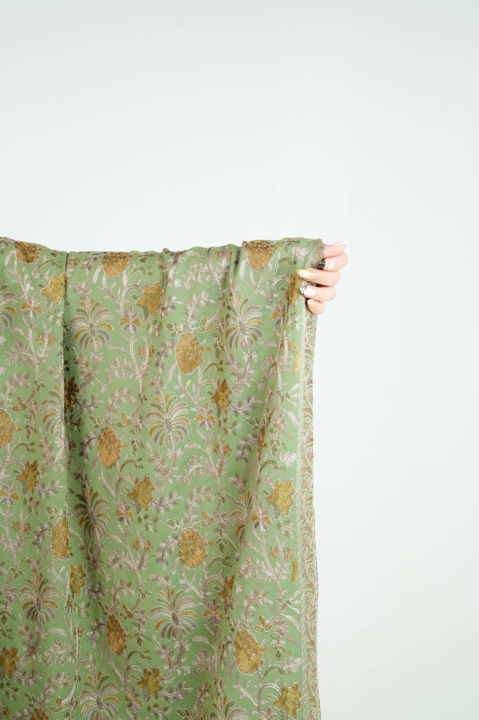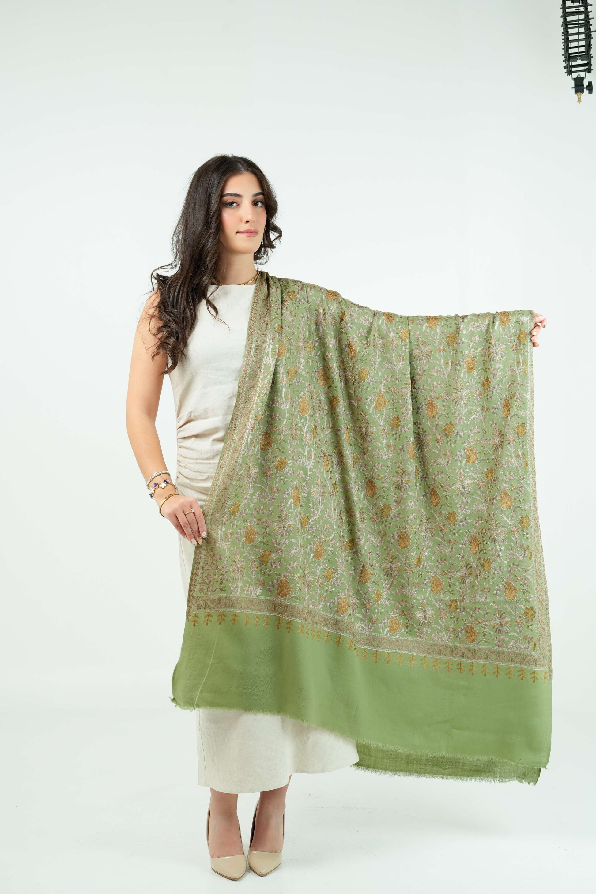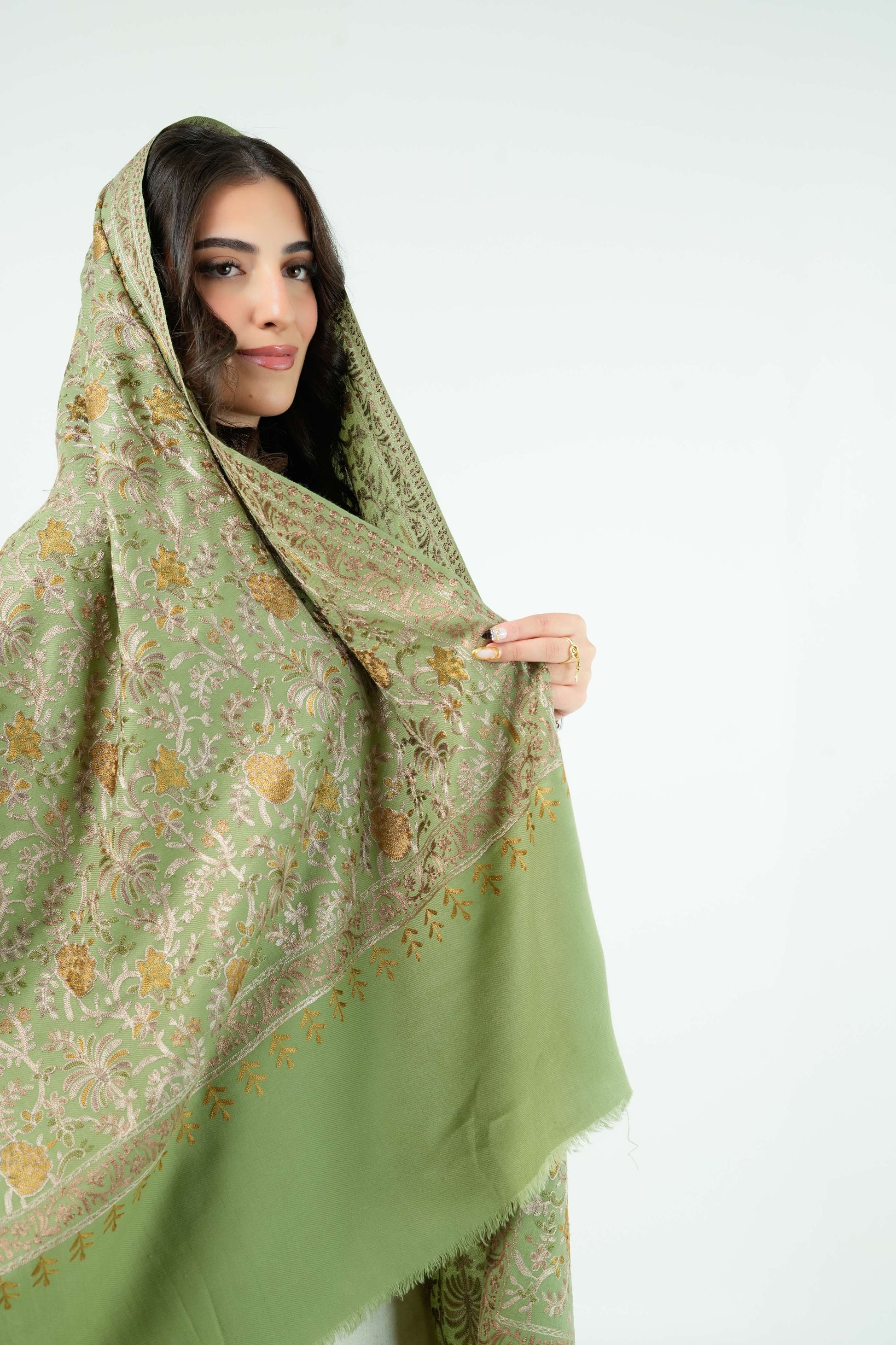 شال باشمينا باللون الأخضر ومطرّز عليه ورود باللون الذهبي الغامق