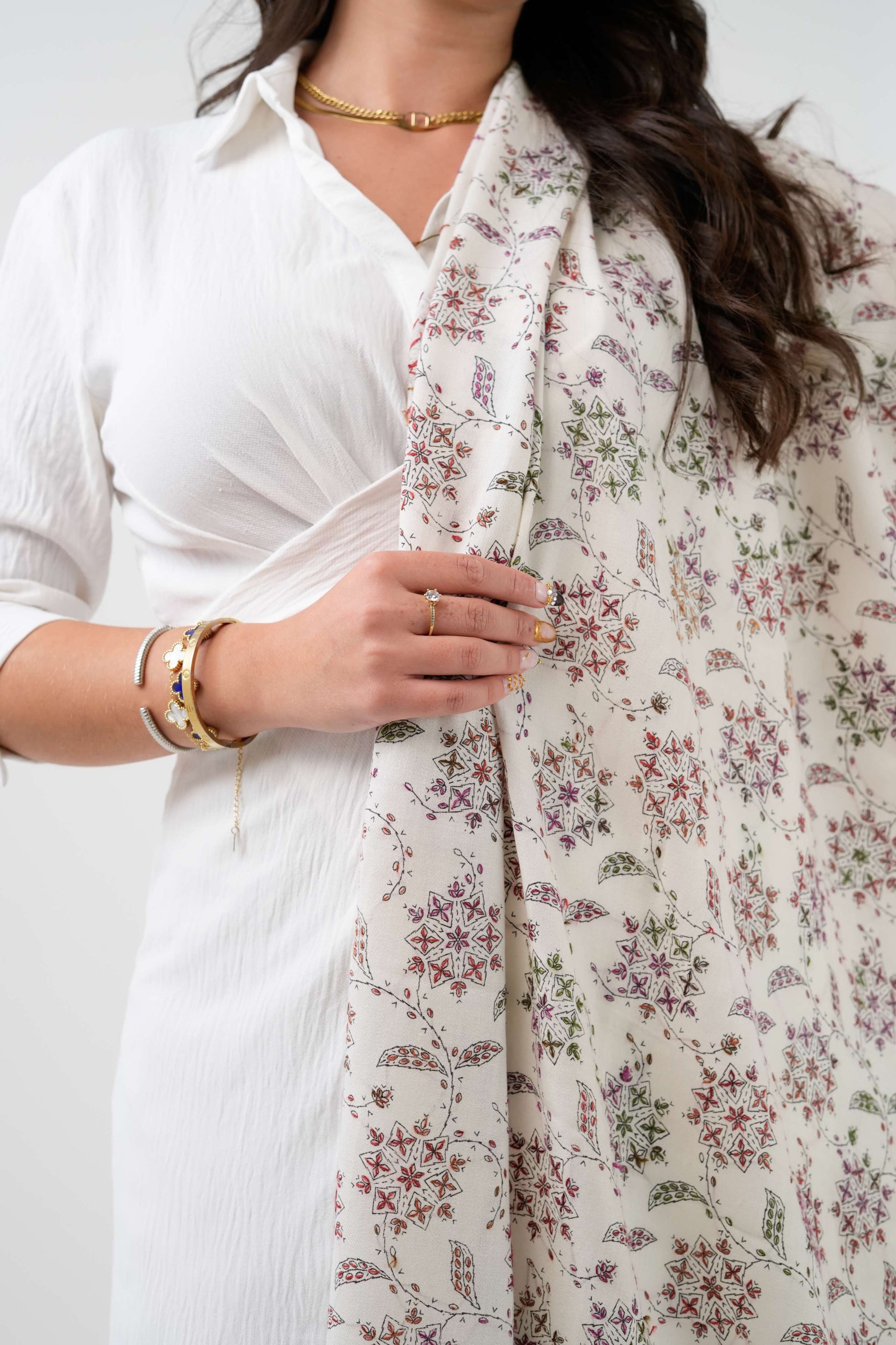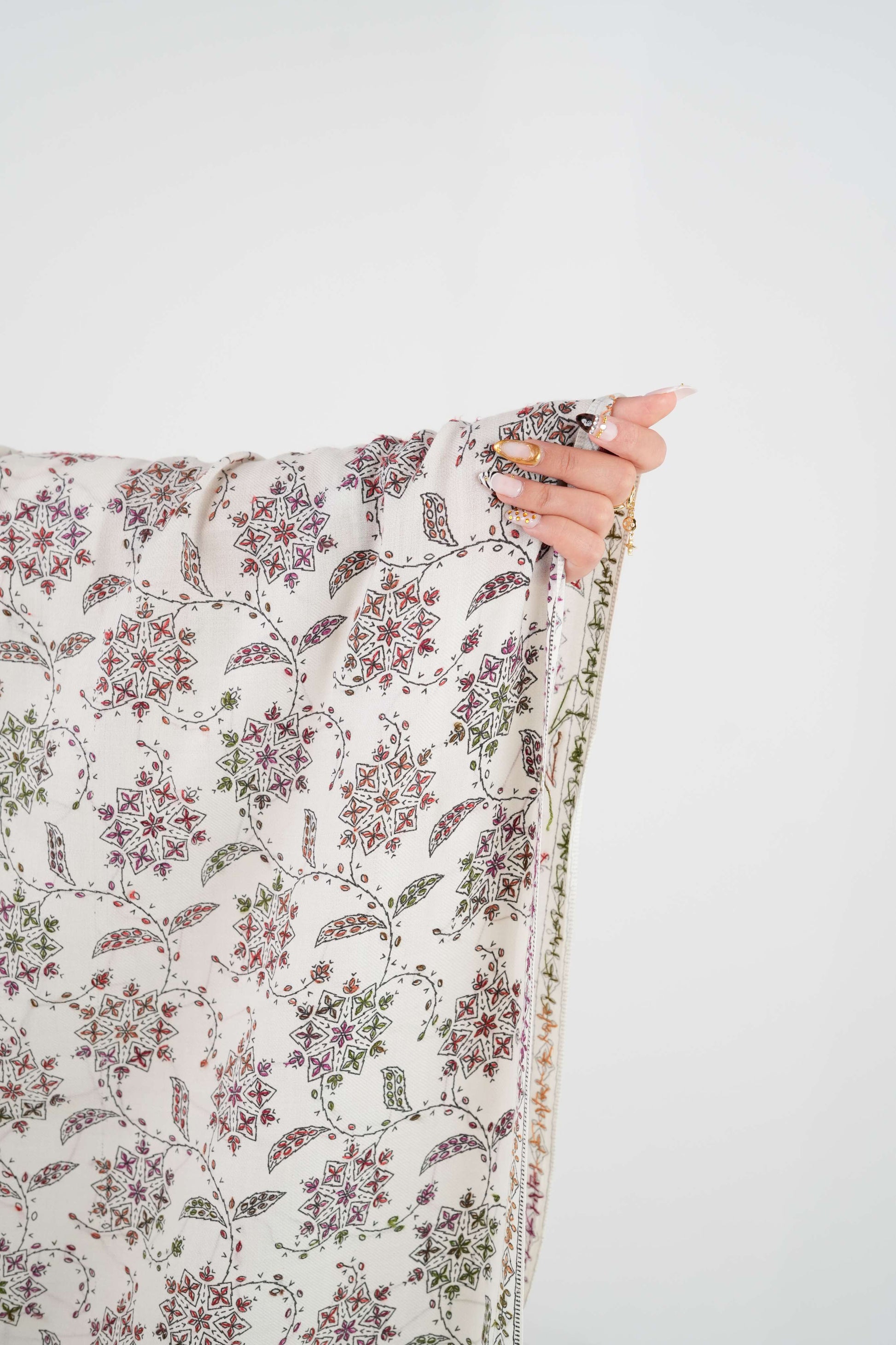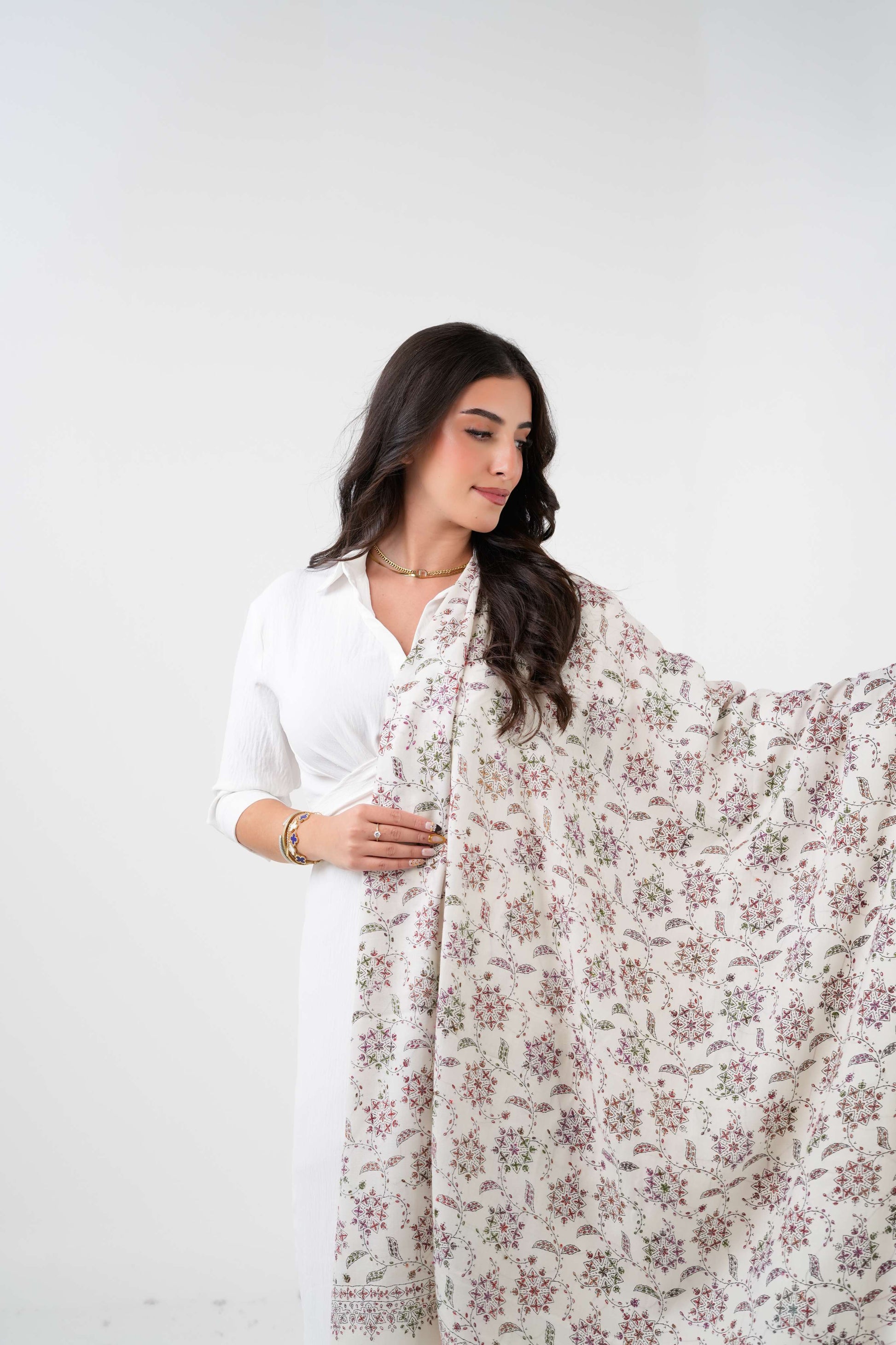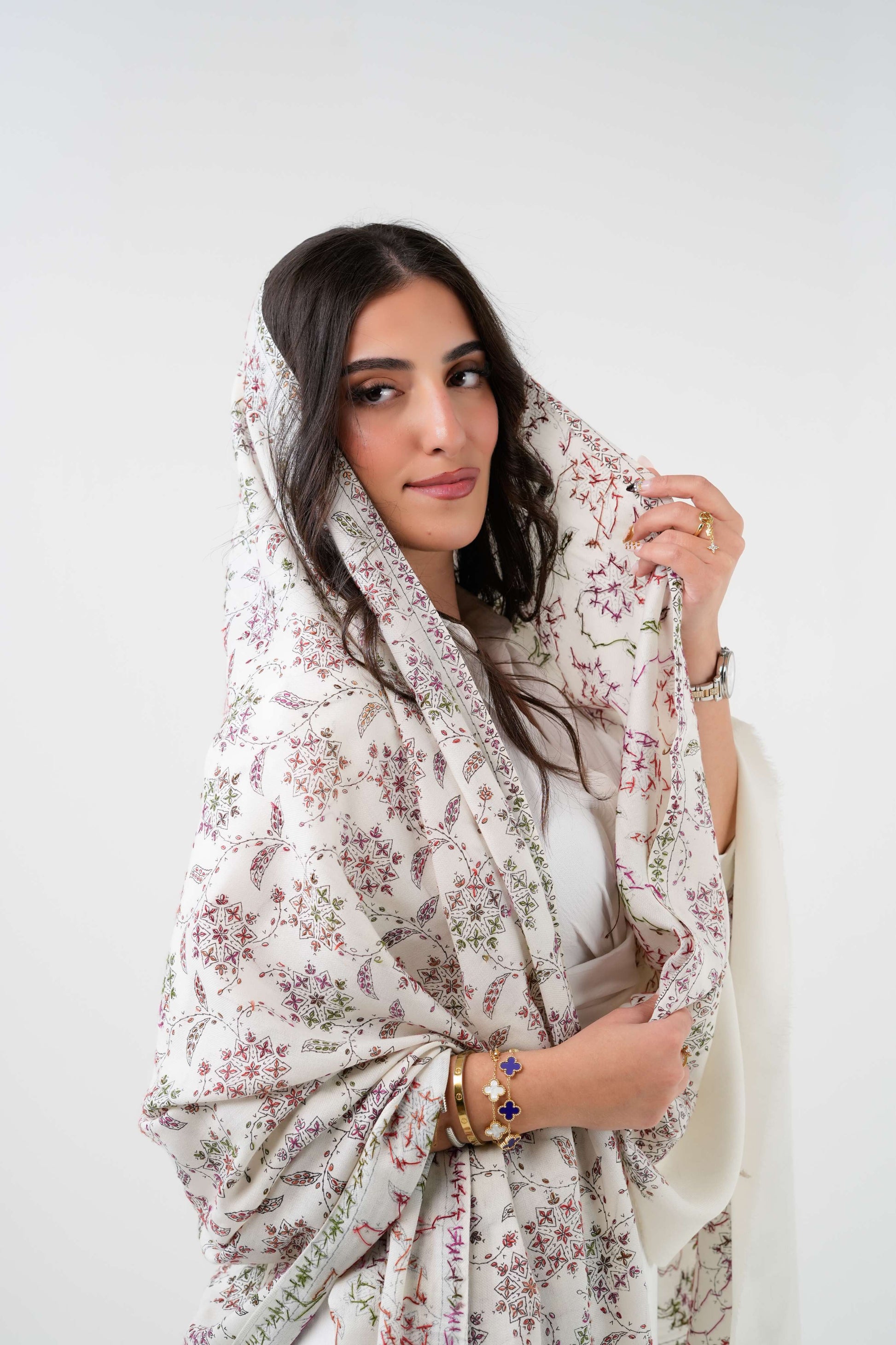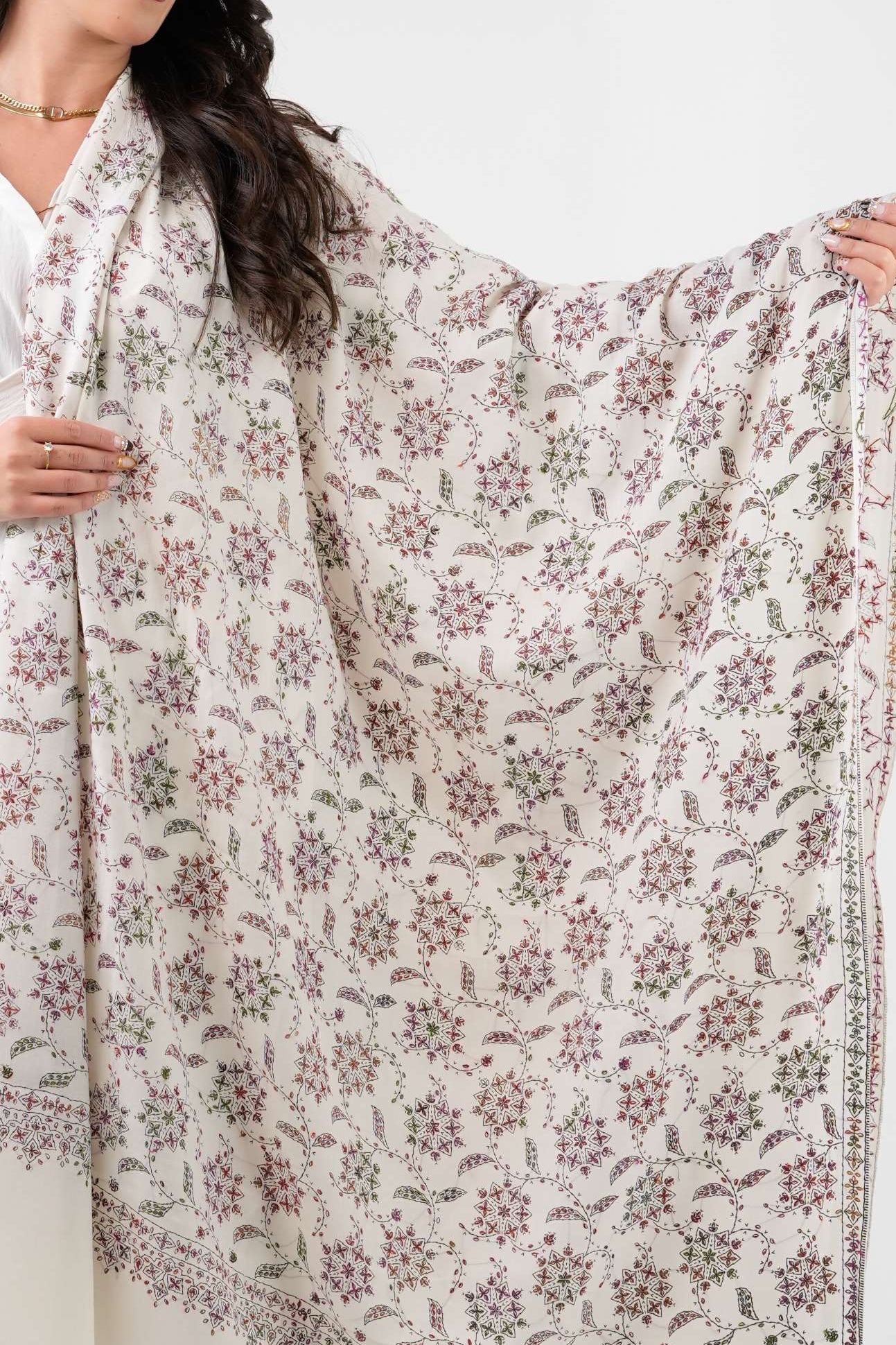 شال باشمينا باللون الأبيض اللؤلؤي مطرز بالألوان تطريزات زهور