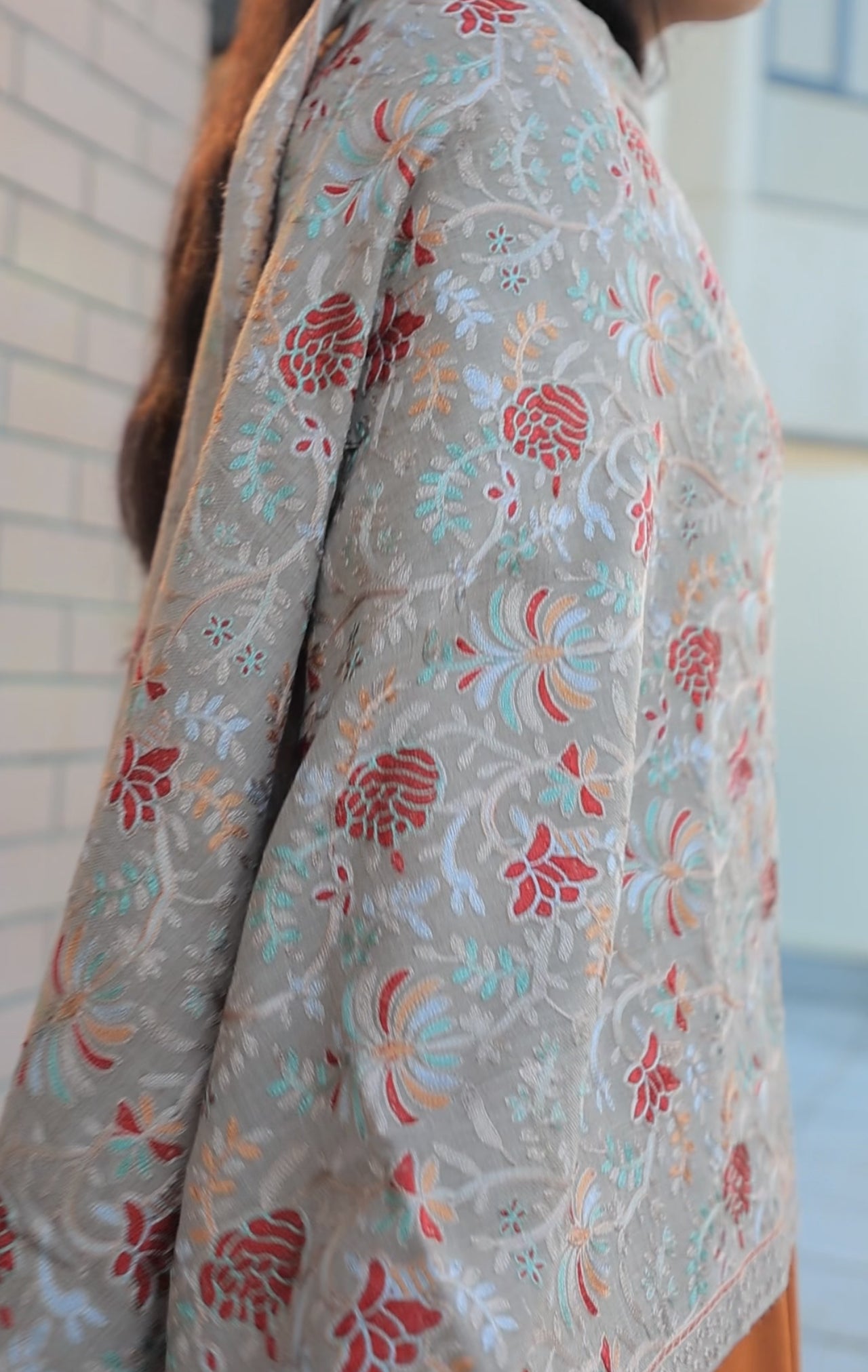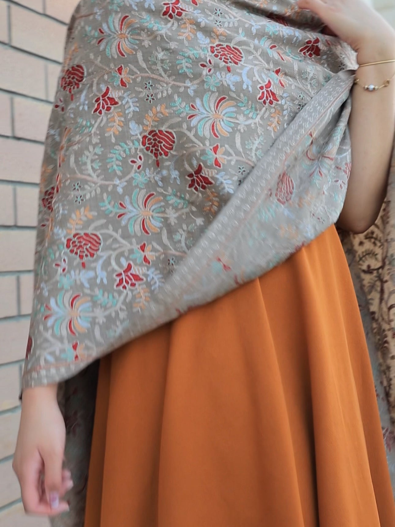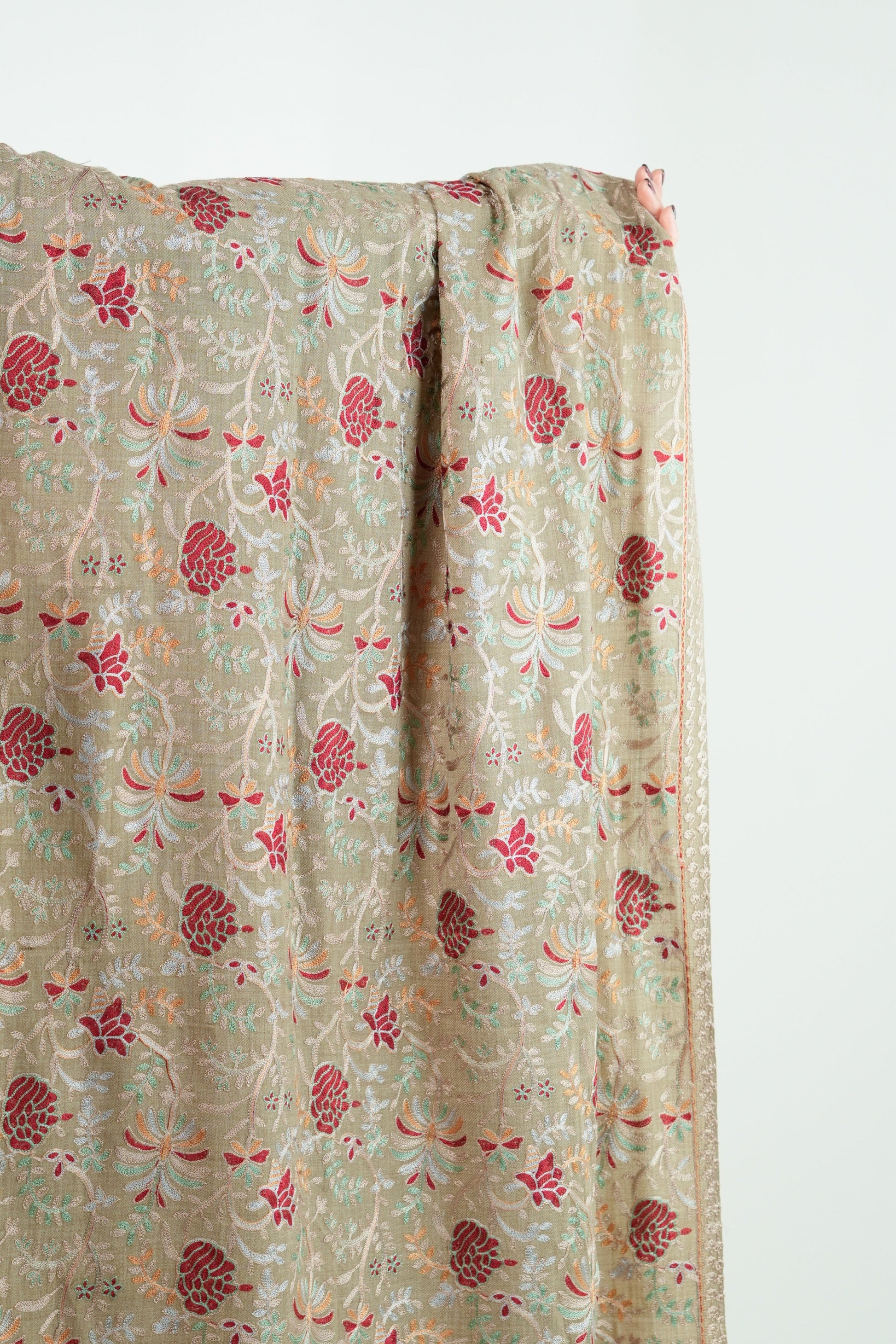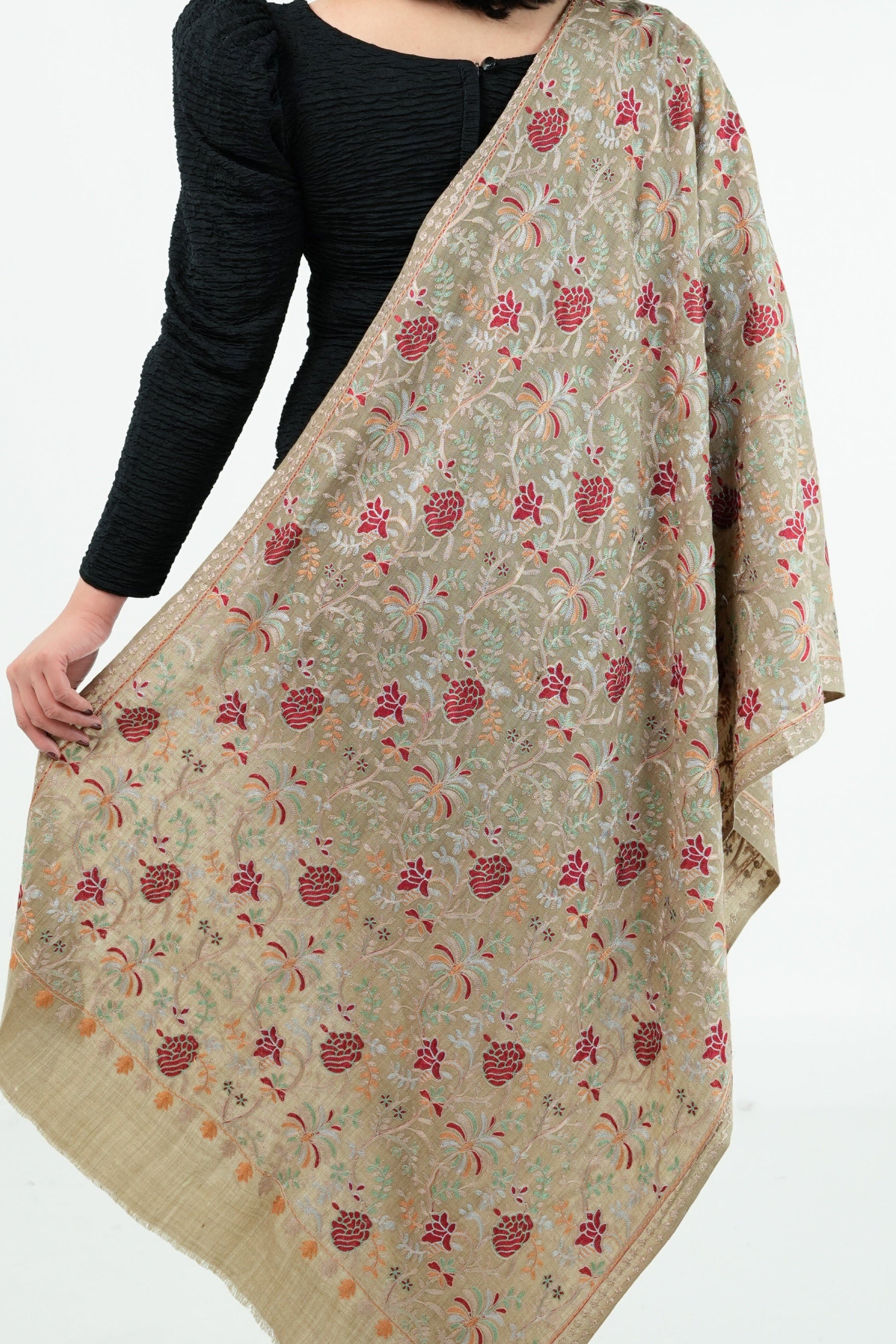 شال بيج مطرّز بالكامل، مزين بنقشات أوراق شجر ومنسوجة بدقّة