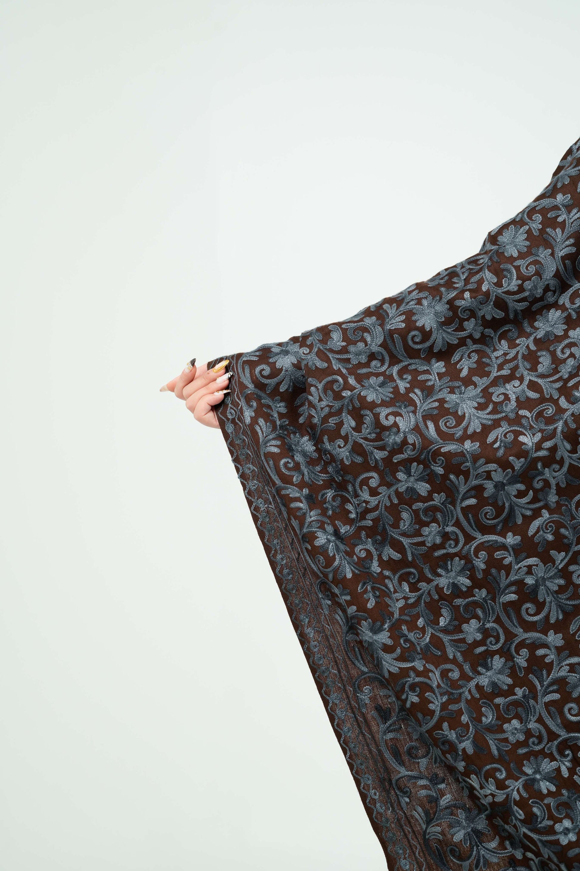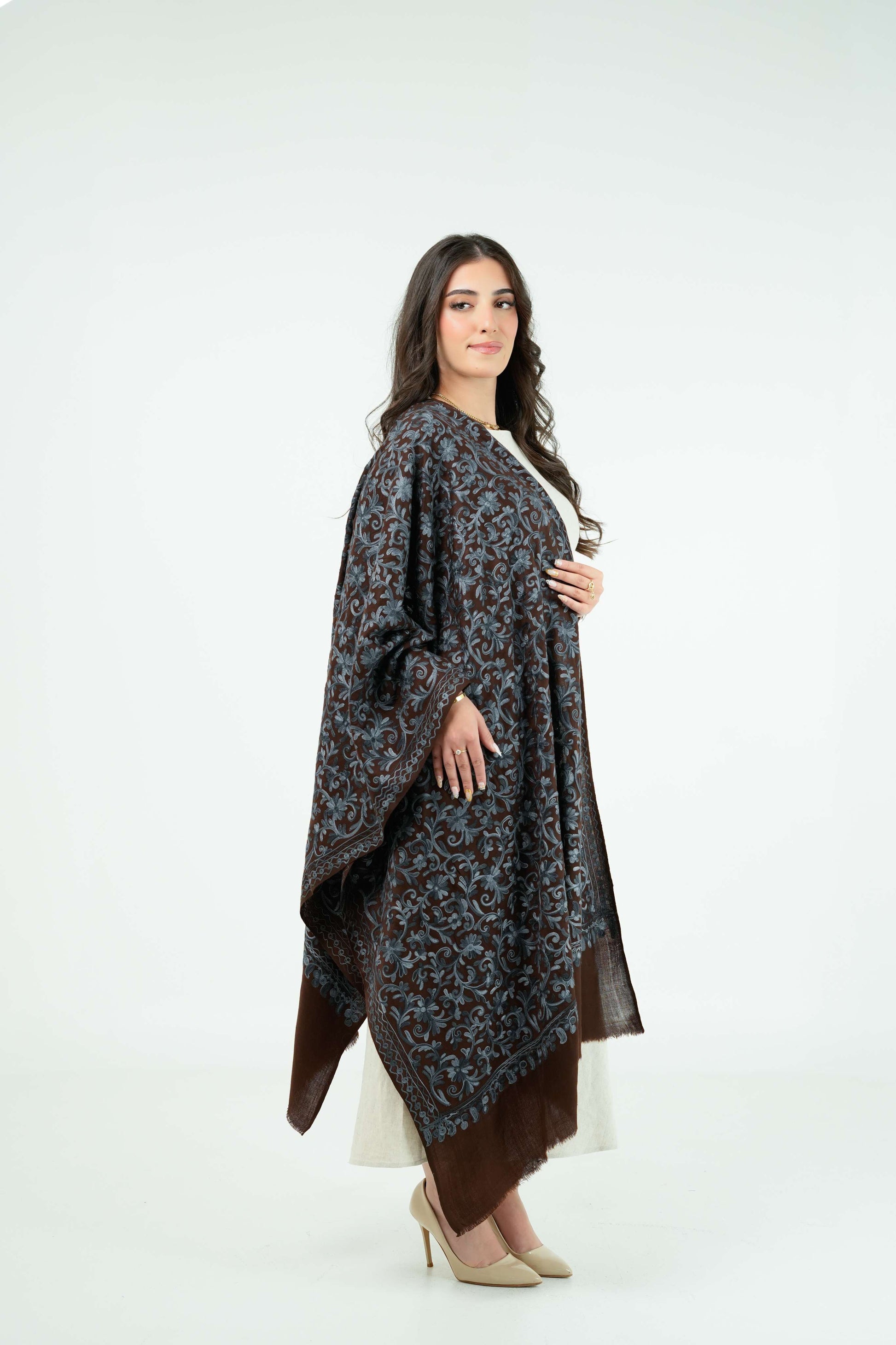 شال باشمينا لونه بني مطرّز باللون الازرق نقوش زهور