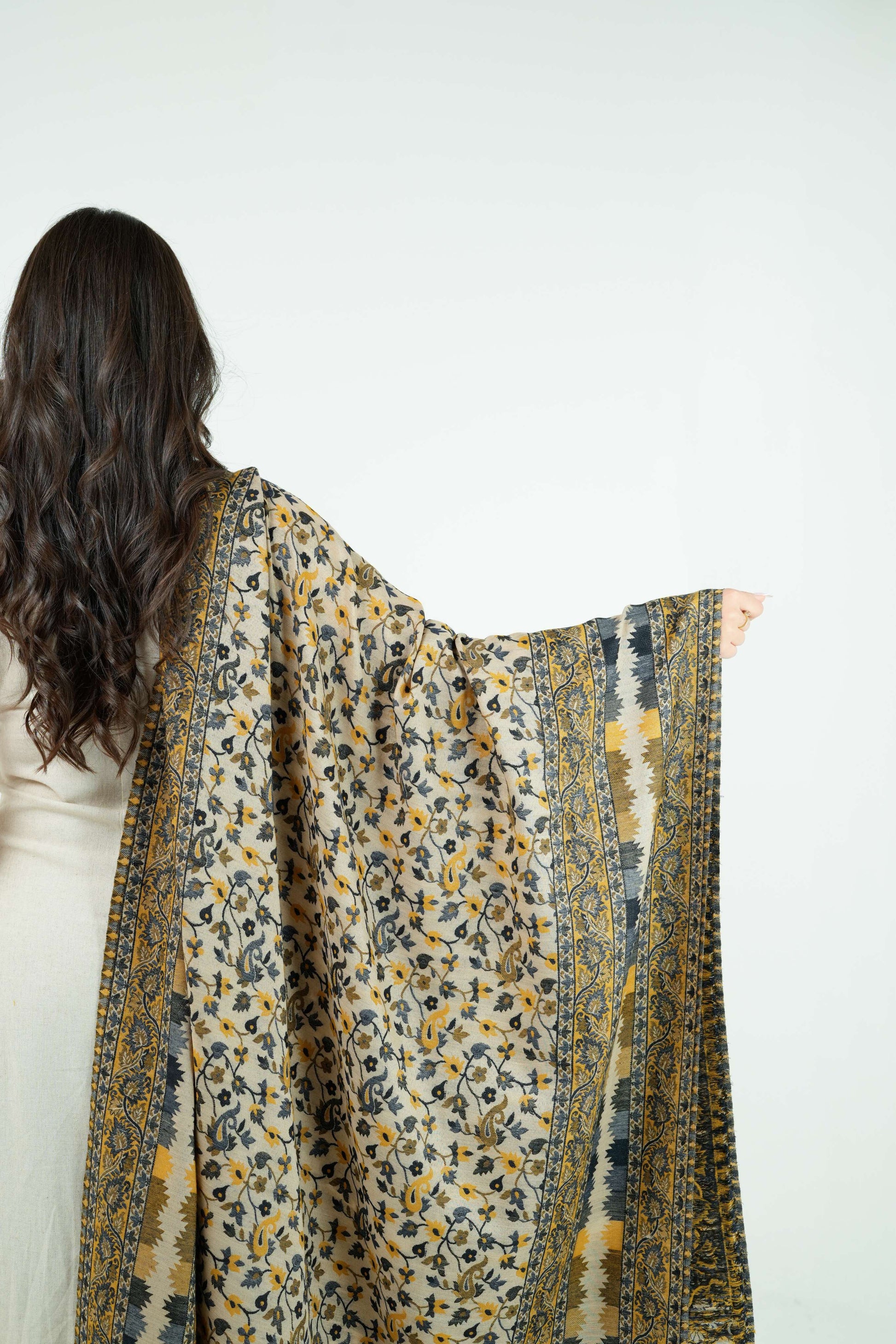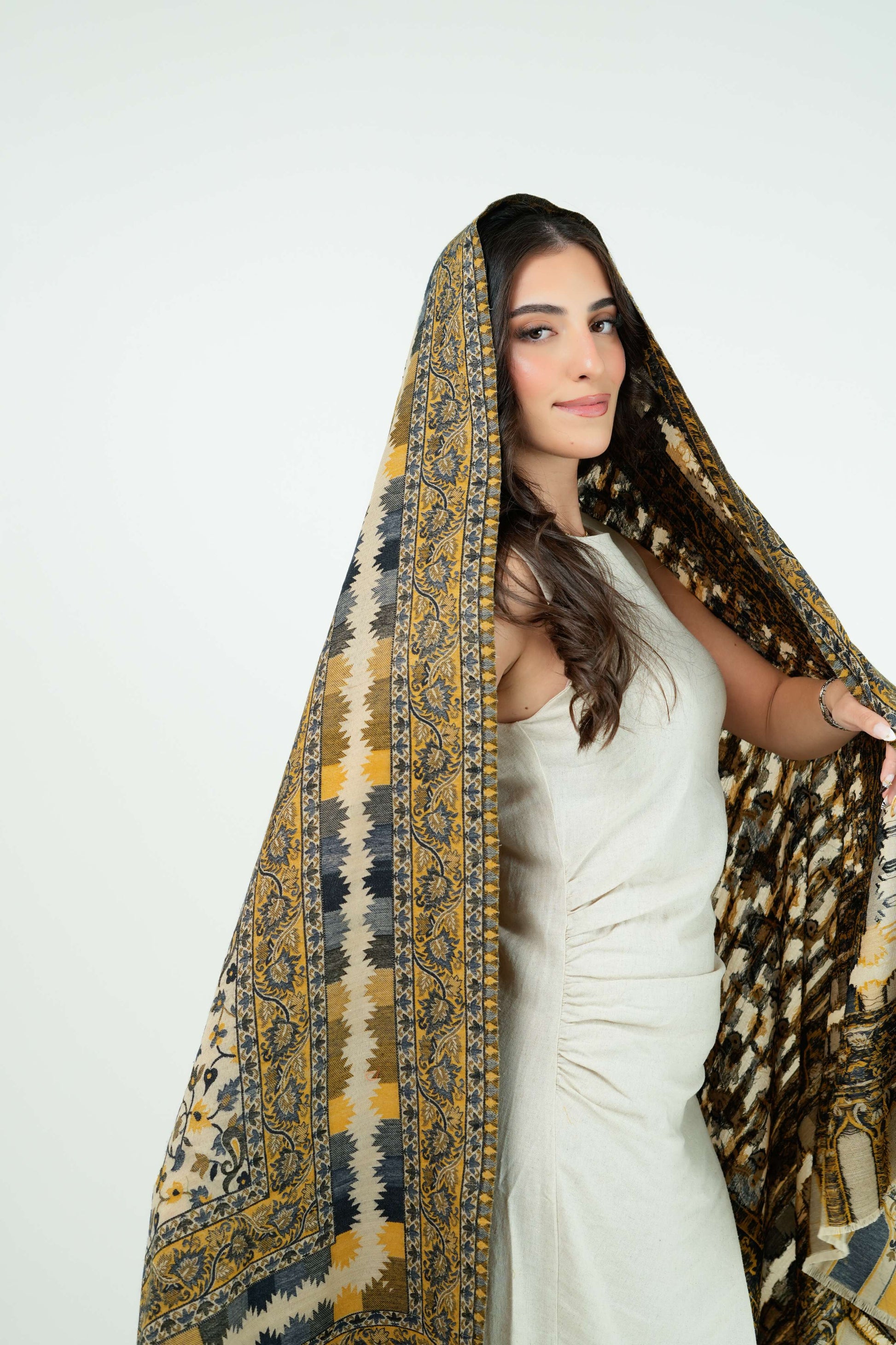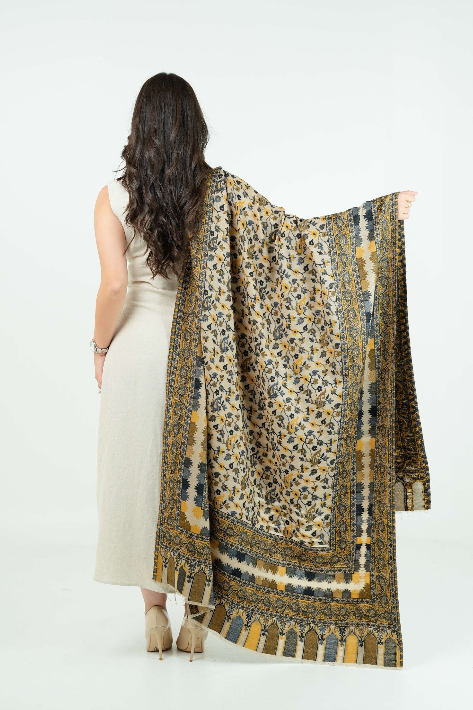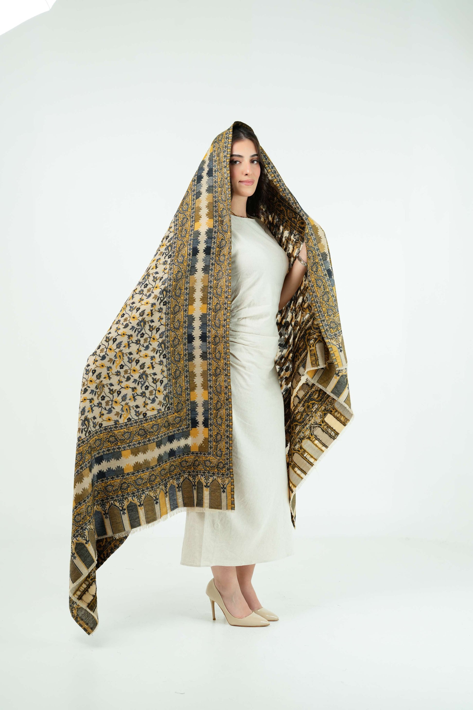شال باشمينا مطرّز يدوياً تطريز كاني مدموج بين الاصفر والذهبي ودرجات من الازرق ومطرّز عليه زهور