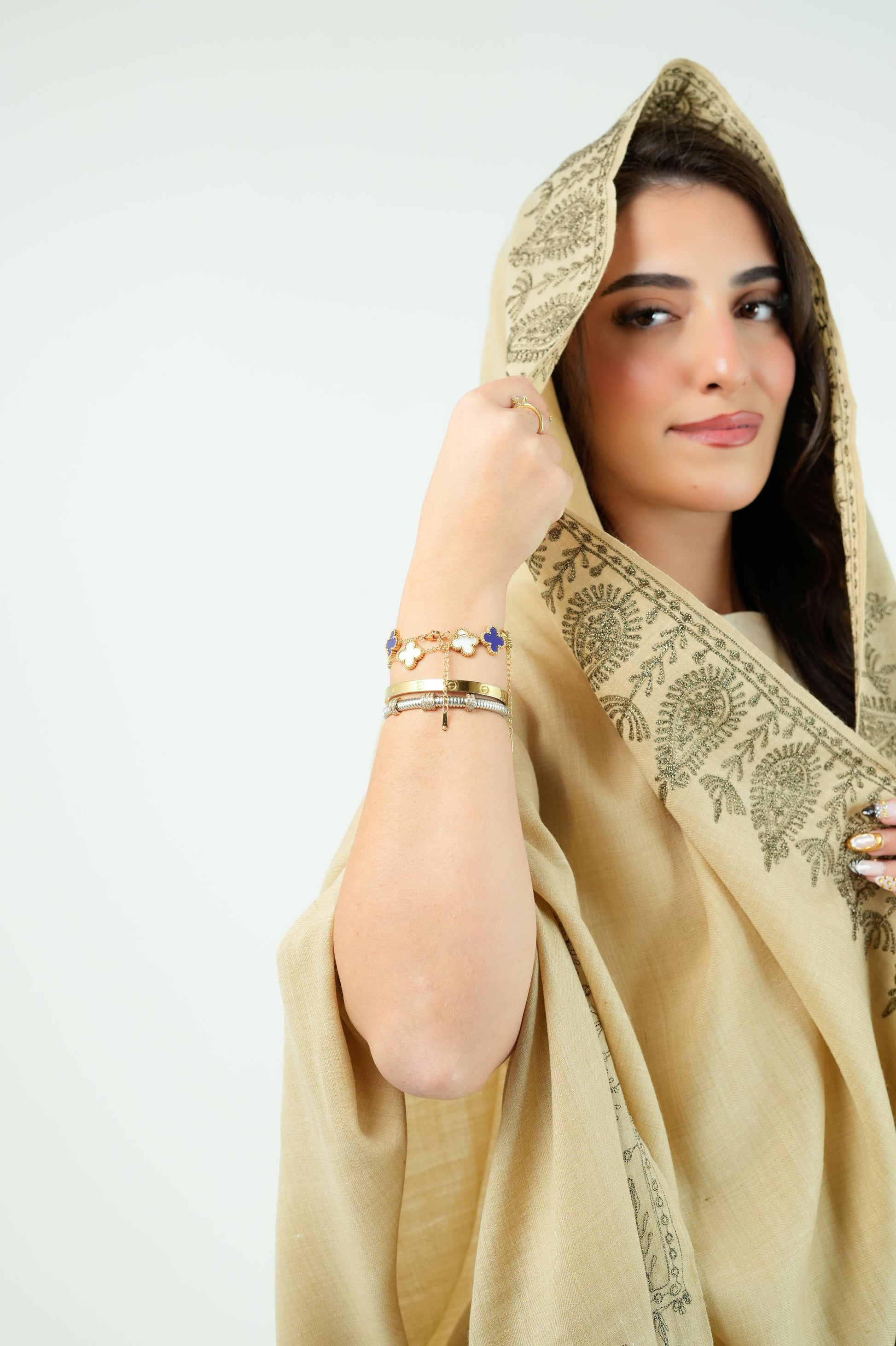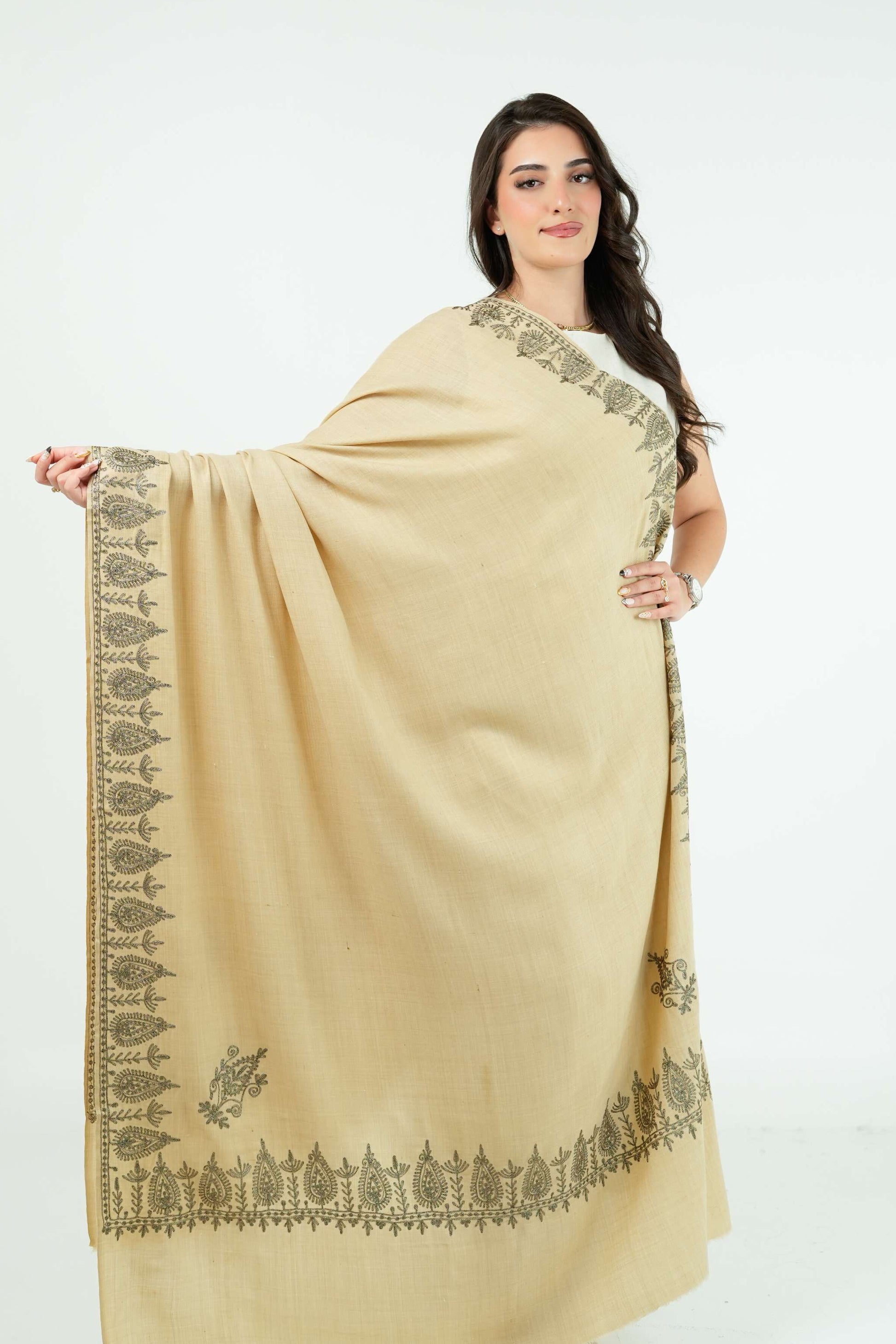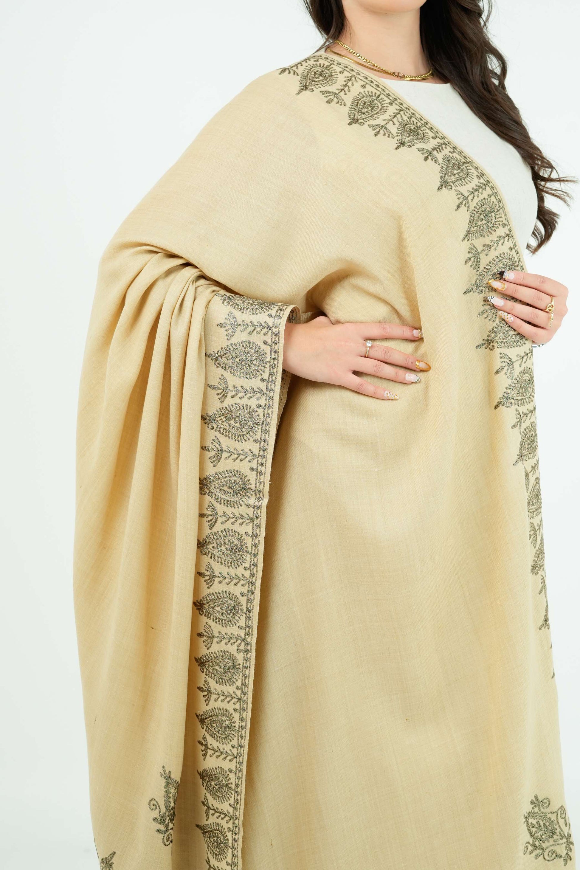 Experience the luxurious Desert Citrine Satoosh Shawl. With its intricately designed tilla floral patterns and soft flowing fabric, this truly elegant piece is timeless.