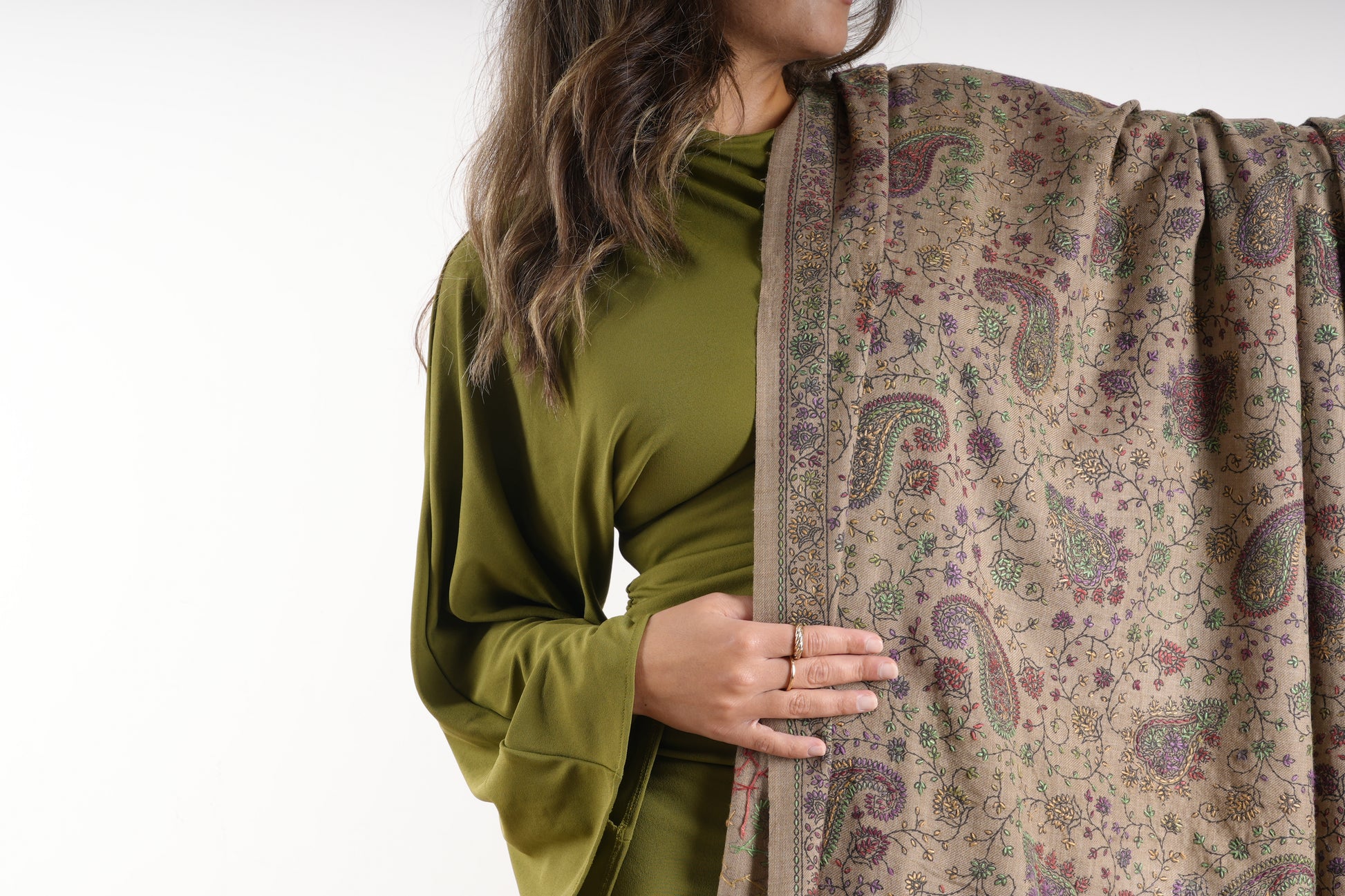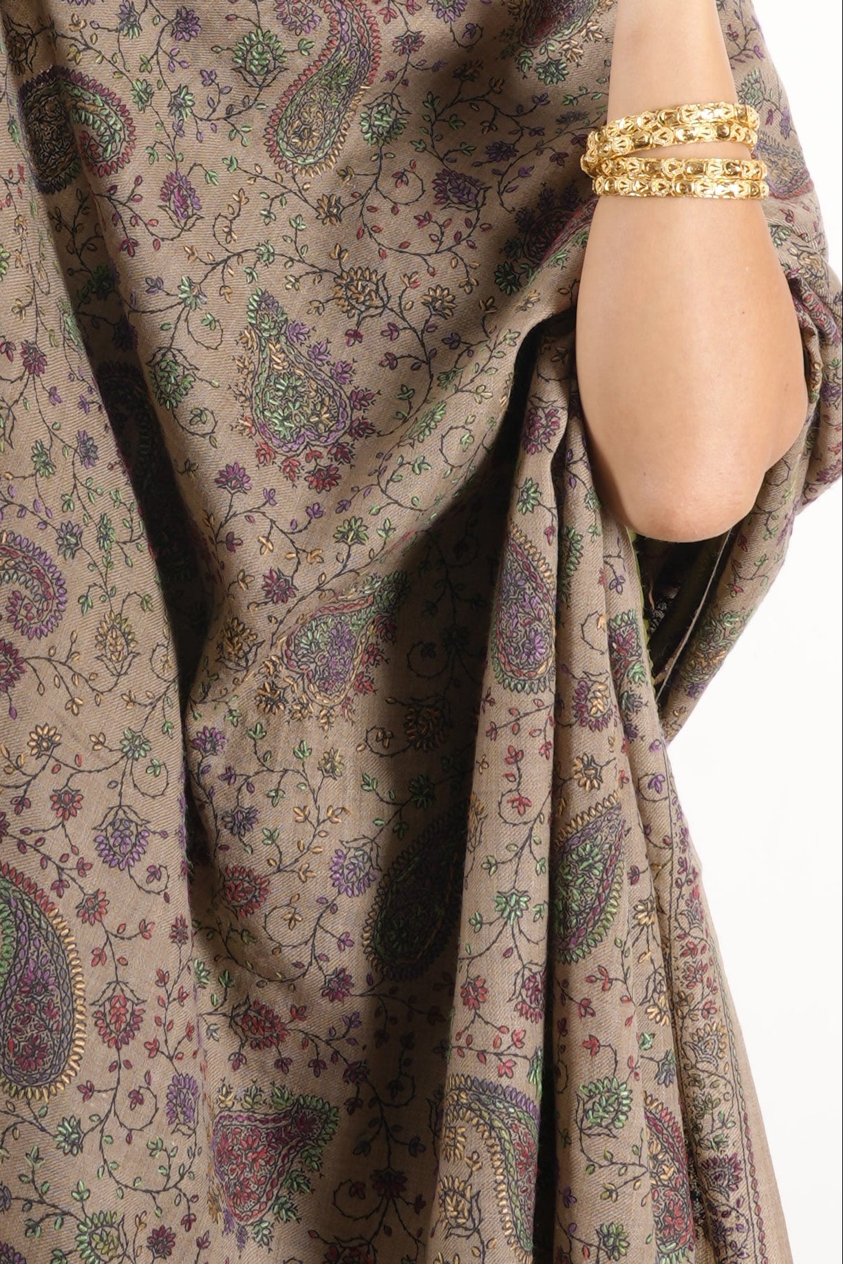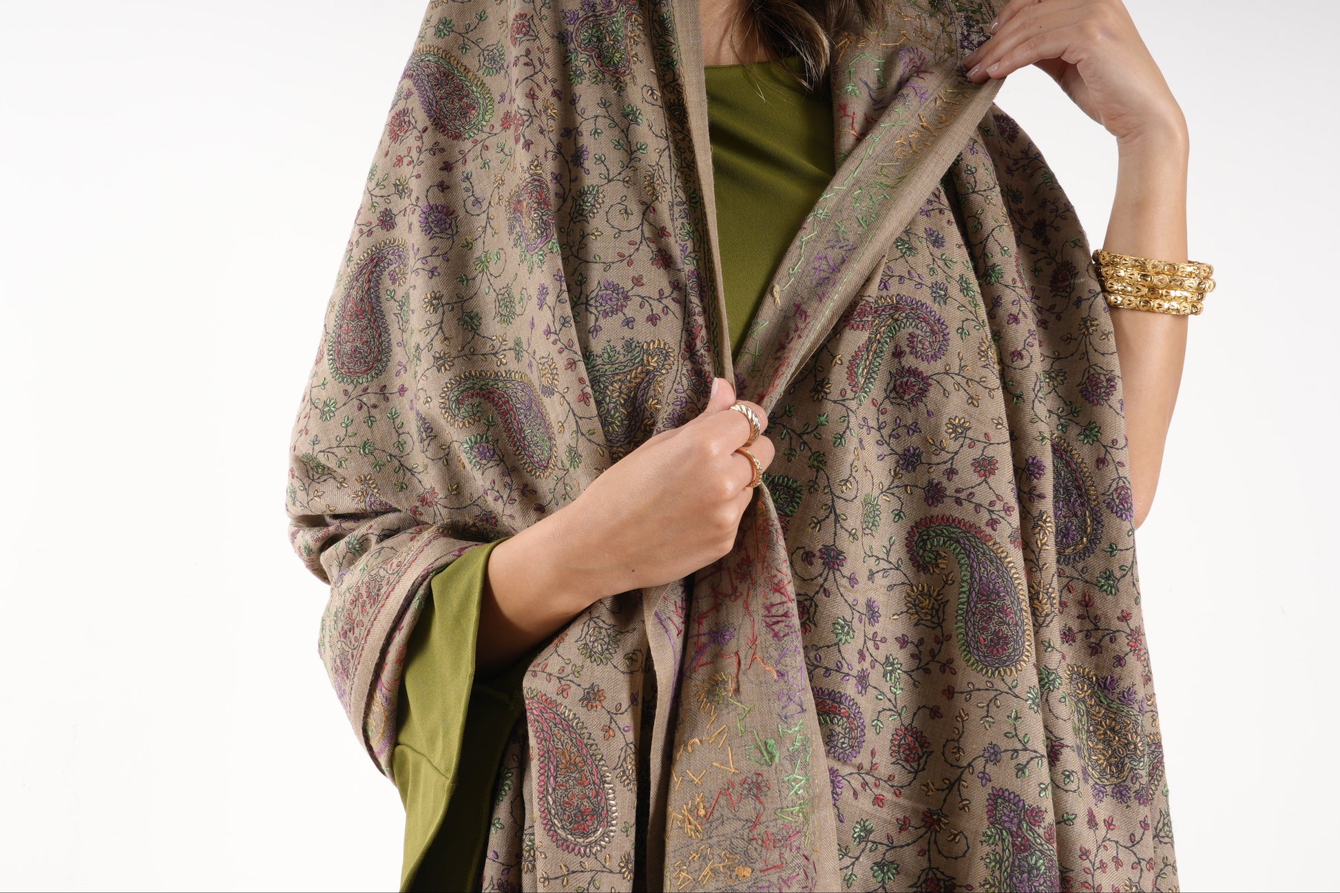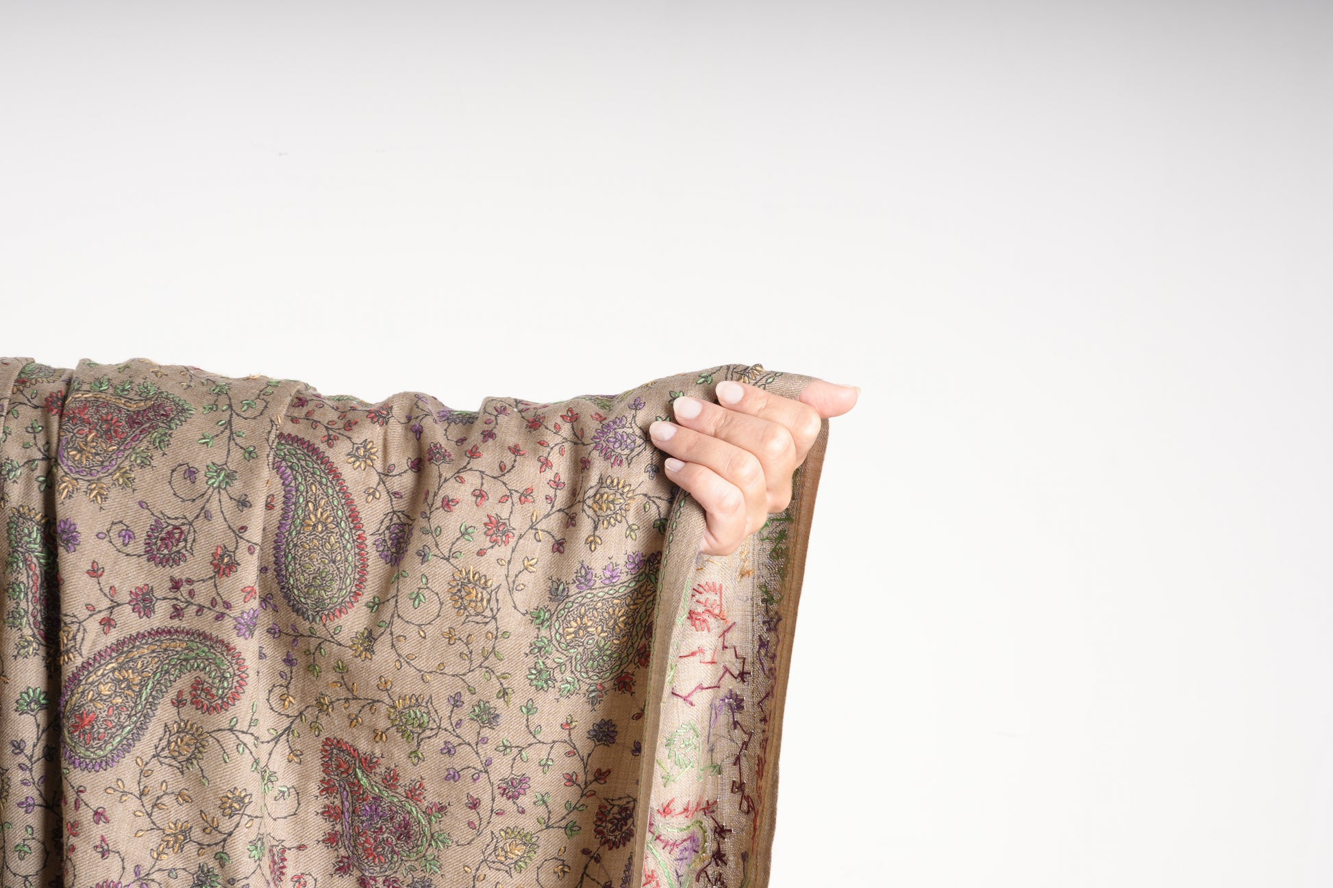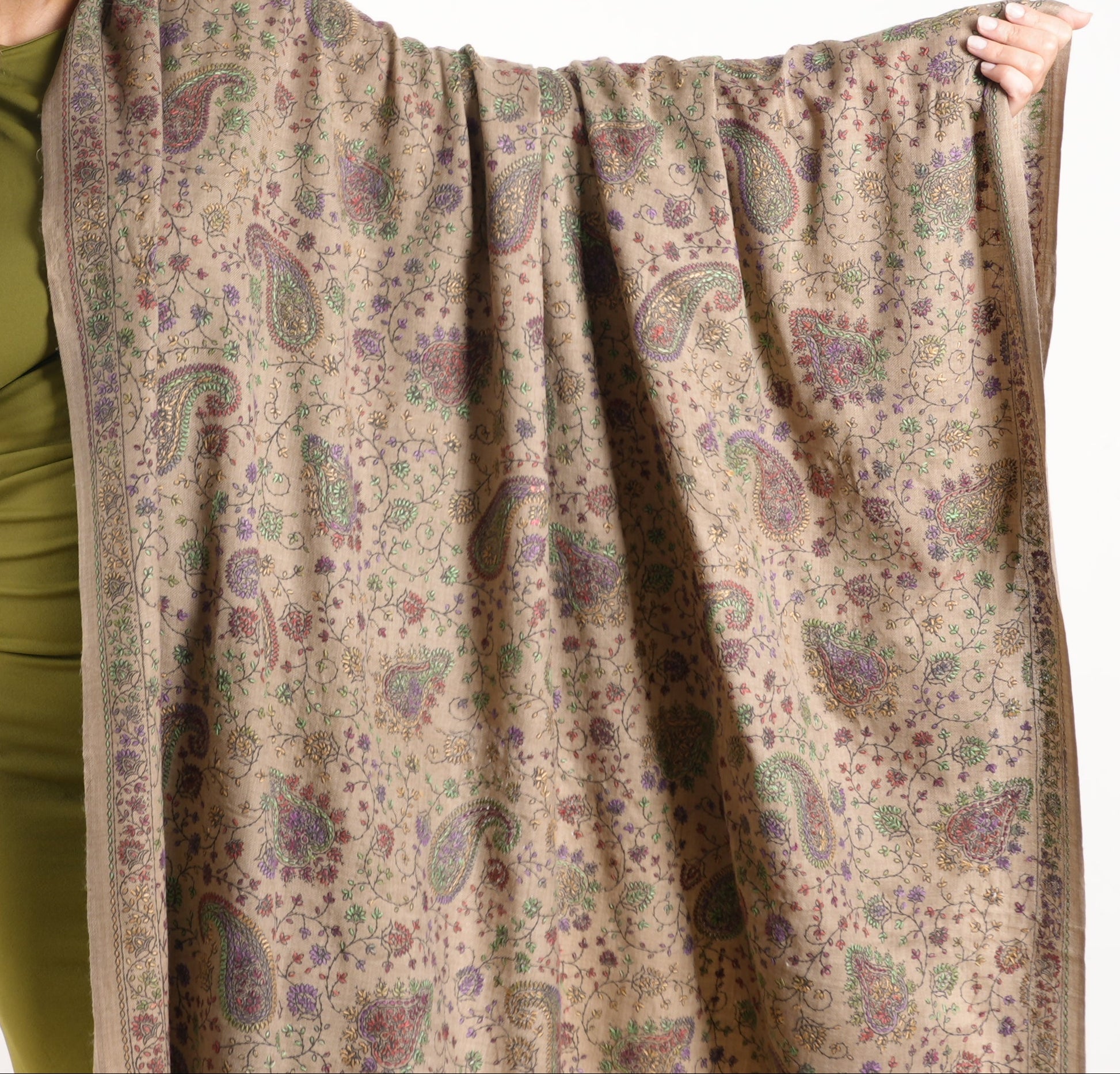 Fully embroidered beige shawls with intricately woven paisley floral patterns.