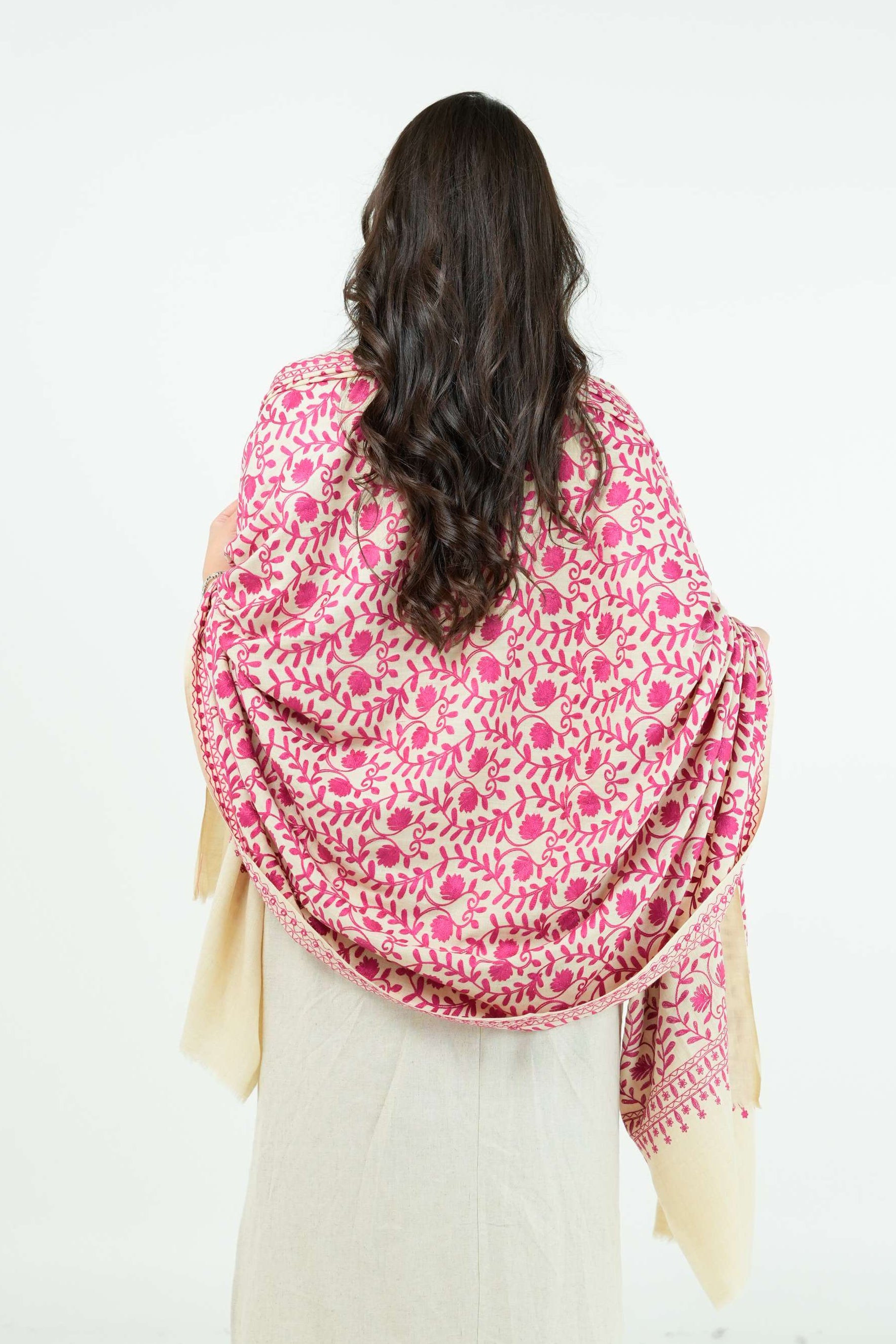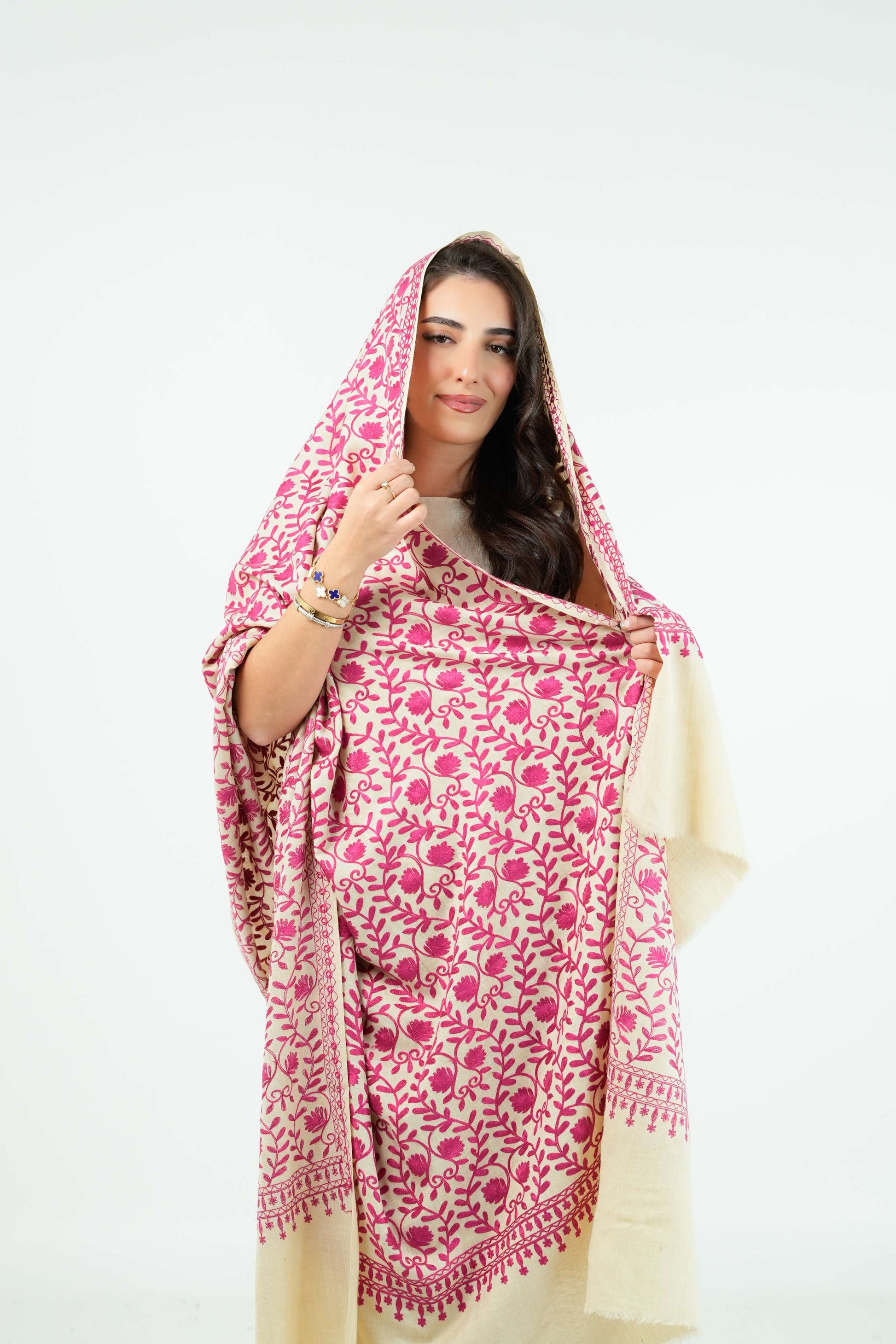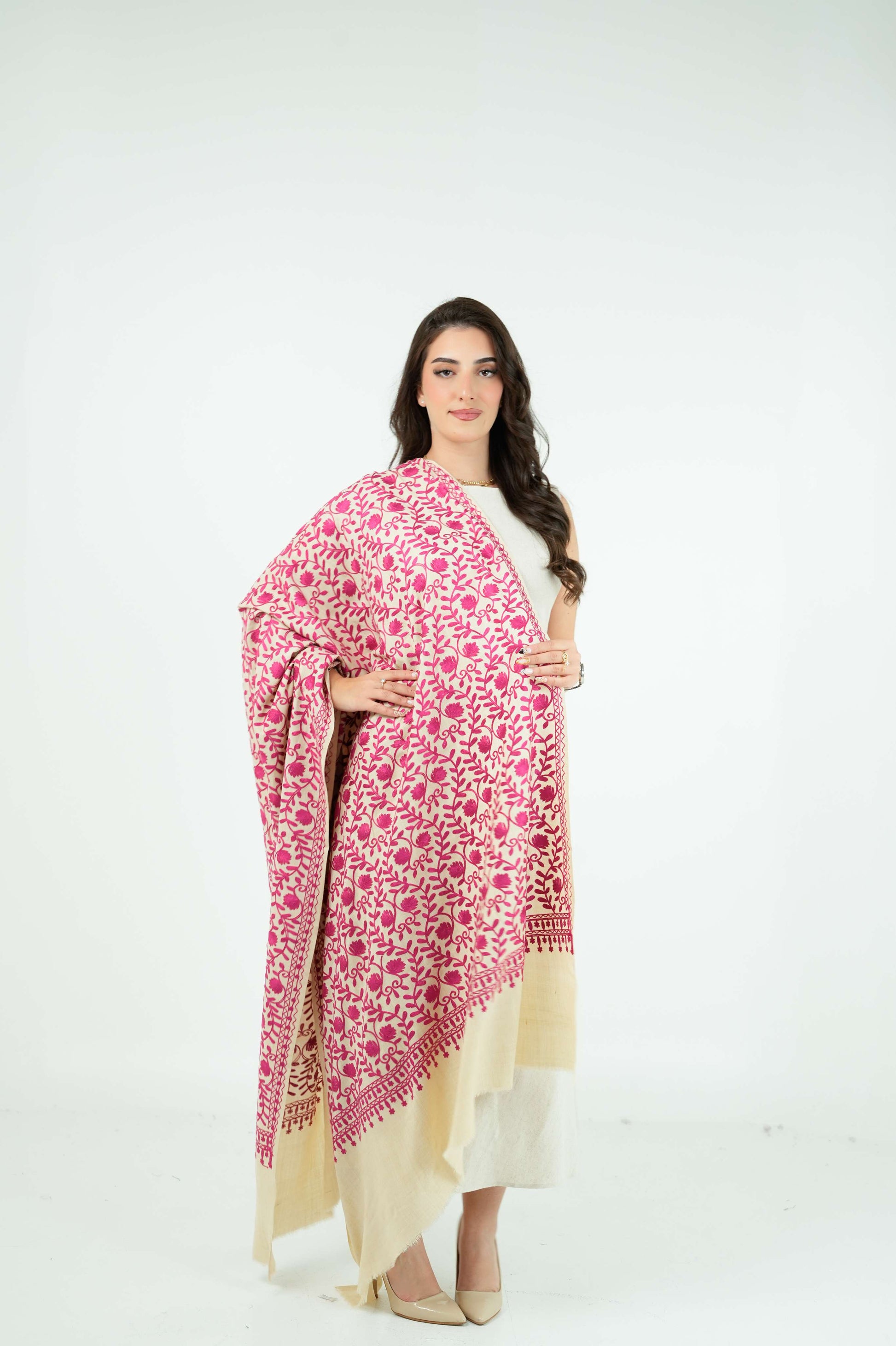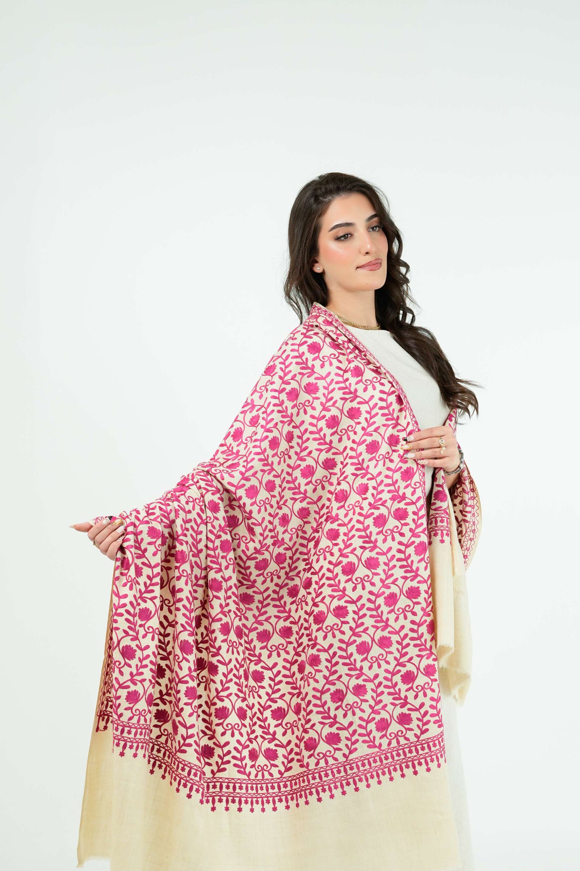 Fully embroidered light base shawl with intricately woven pink floral patterns.